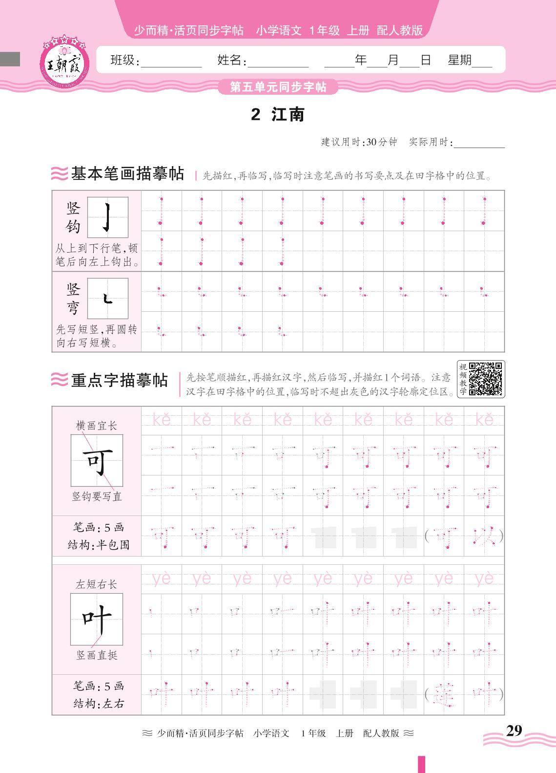 2024秋上册一年级语文人教版 第五单元同步字帖——2. 江南