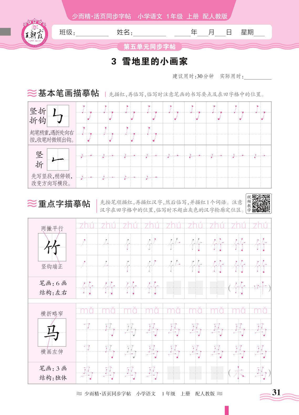 2024秋上册一年级语文人教版 第五单元同步字帖——3. 雪地里的小画家
