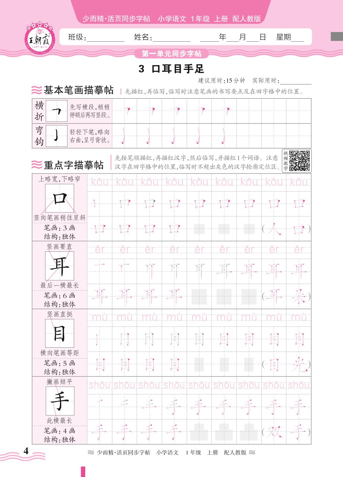 2024秋上册一年级语文人教版 第一单元同步字帖——3. 口耳目手足