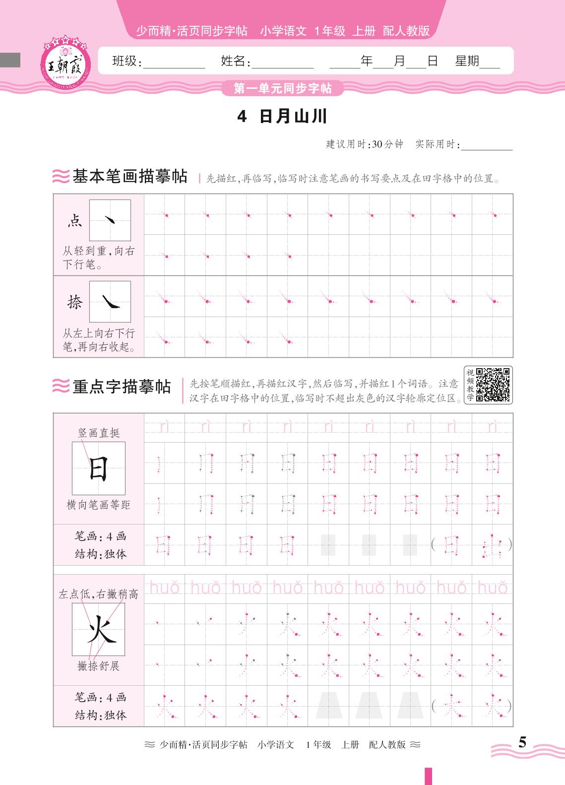2024秋上册一年级语文人教版 第一单元同步字帖——4. 日月山川