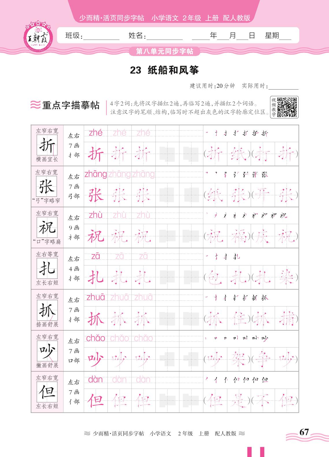 2024秋上册二年级语文人教版 第八单元同步字帖——23. 纸船和风筝