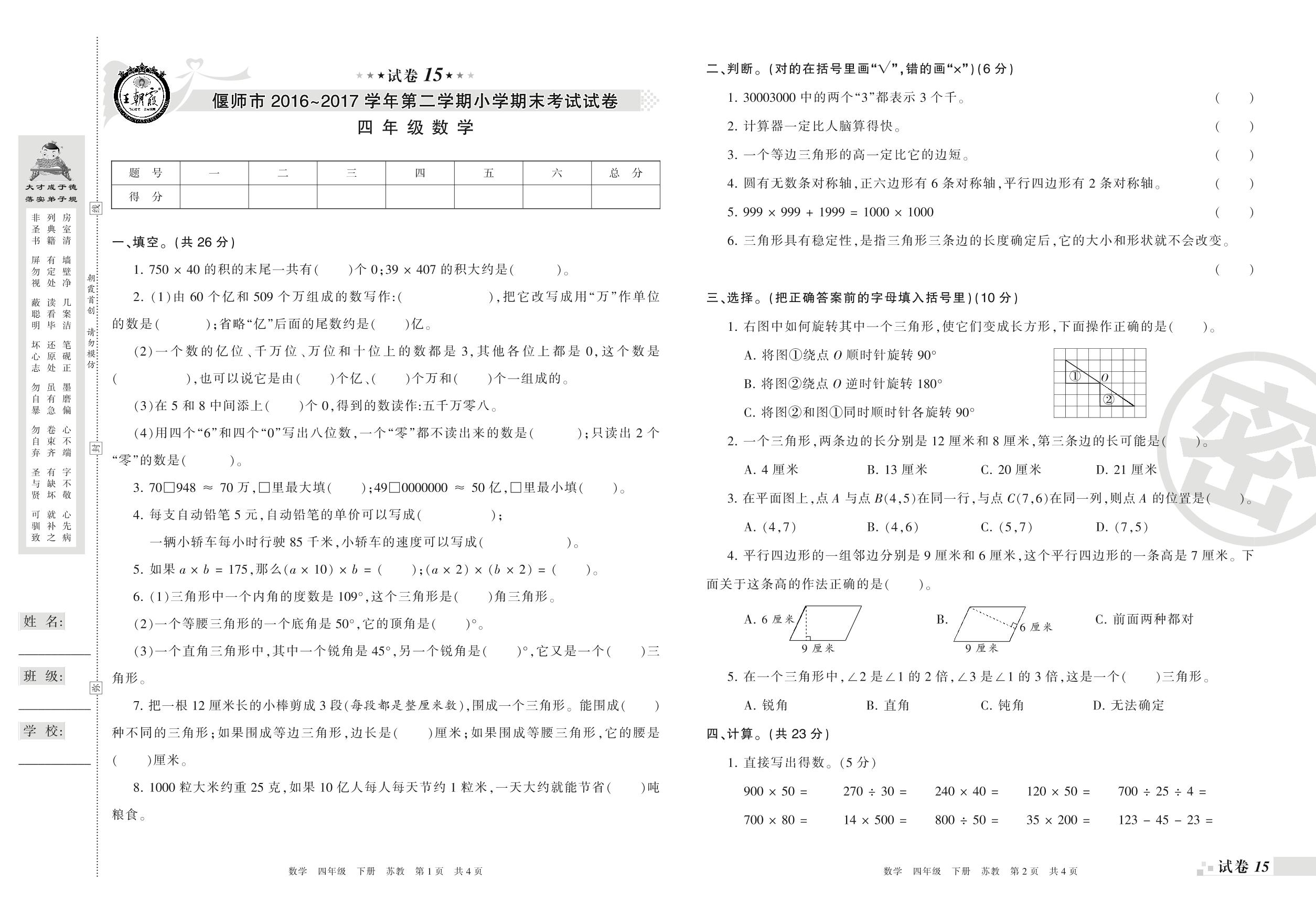 2016-2017学年第二学期偃师市四年级数学试卷(苏教版)【15】