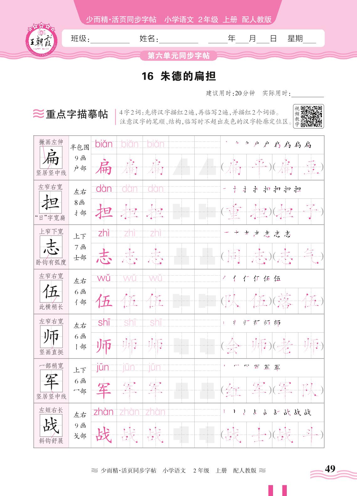 2024秋上册二年级语文人教版 第六单元同步字帖——16. 朱德的扁担