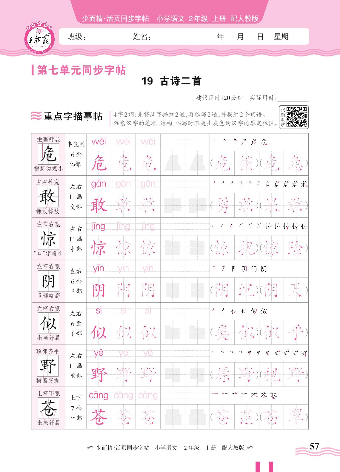 2024秋上册二年级语文人教版 第七单元同步字帖——19. 古诗二首
