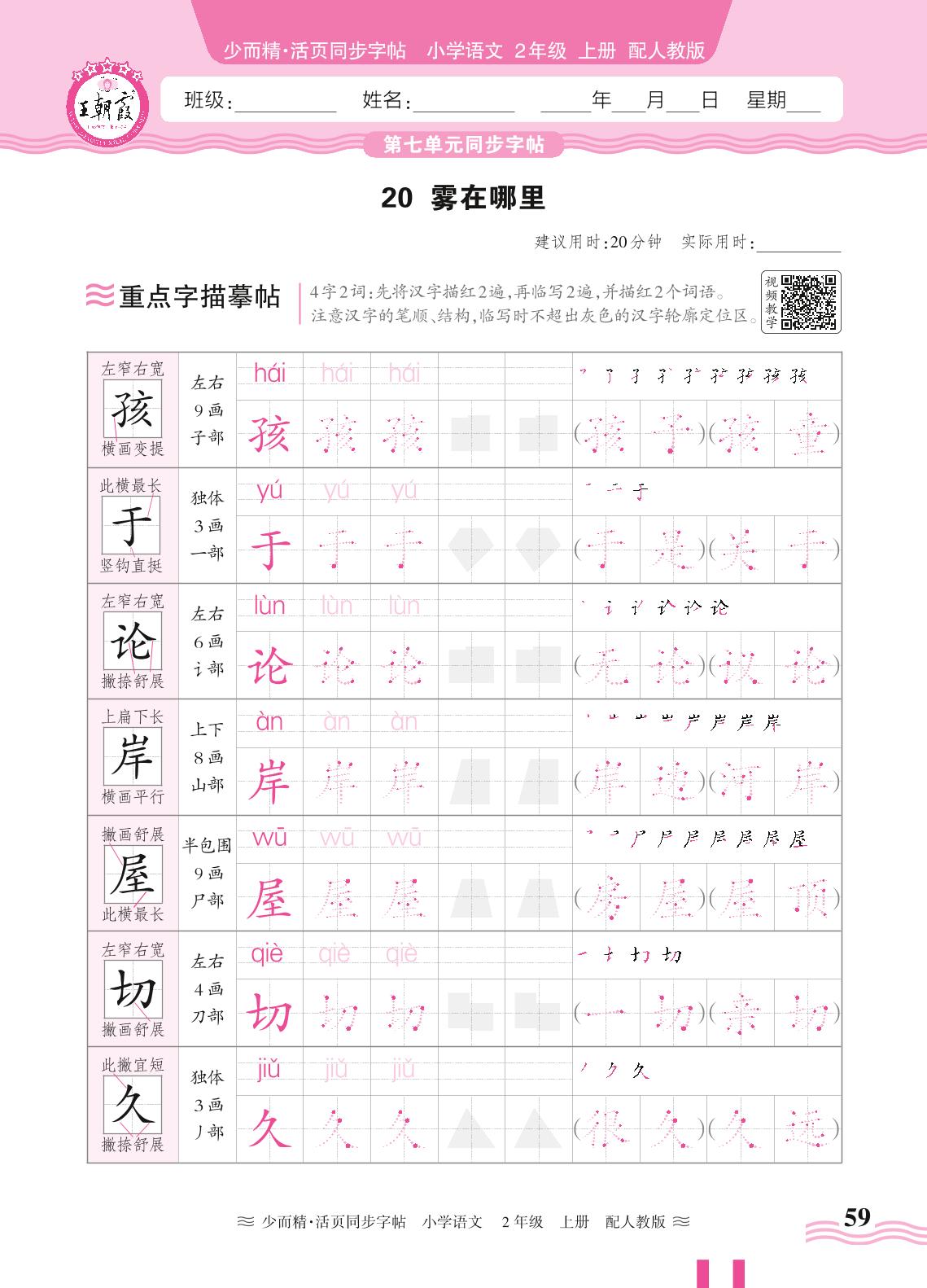 2024秋上册二年级语文人教版 第七单元同步字帖——20. 雾在哪里