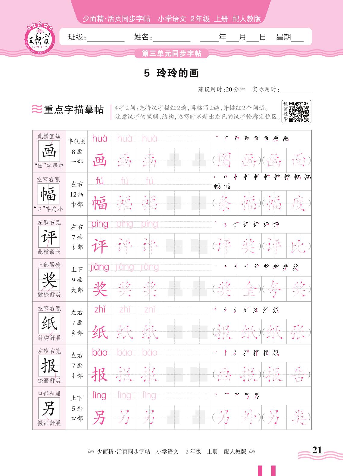 2024秋上册二年级语文人教版 第三单元同步字帖——5. 玲玲的画