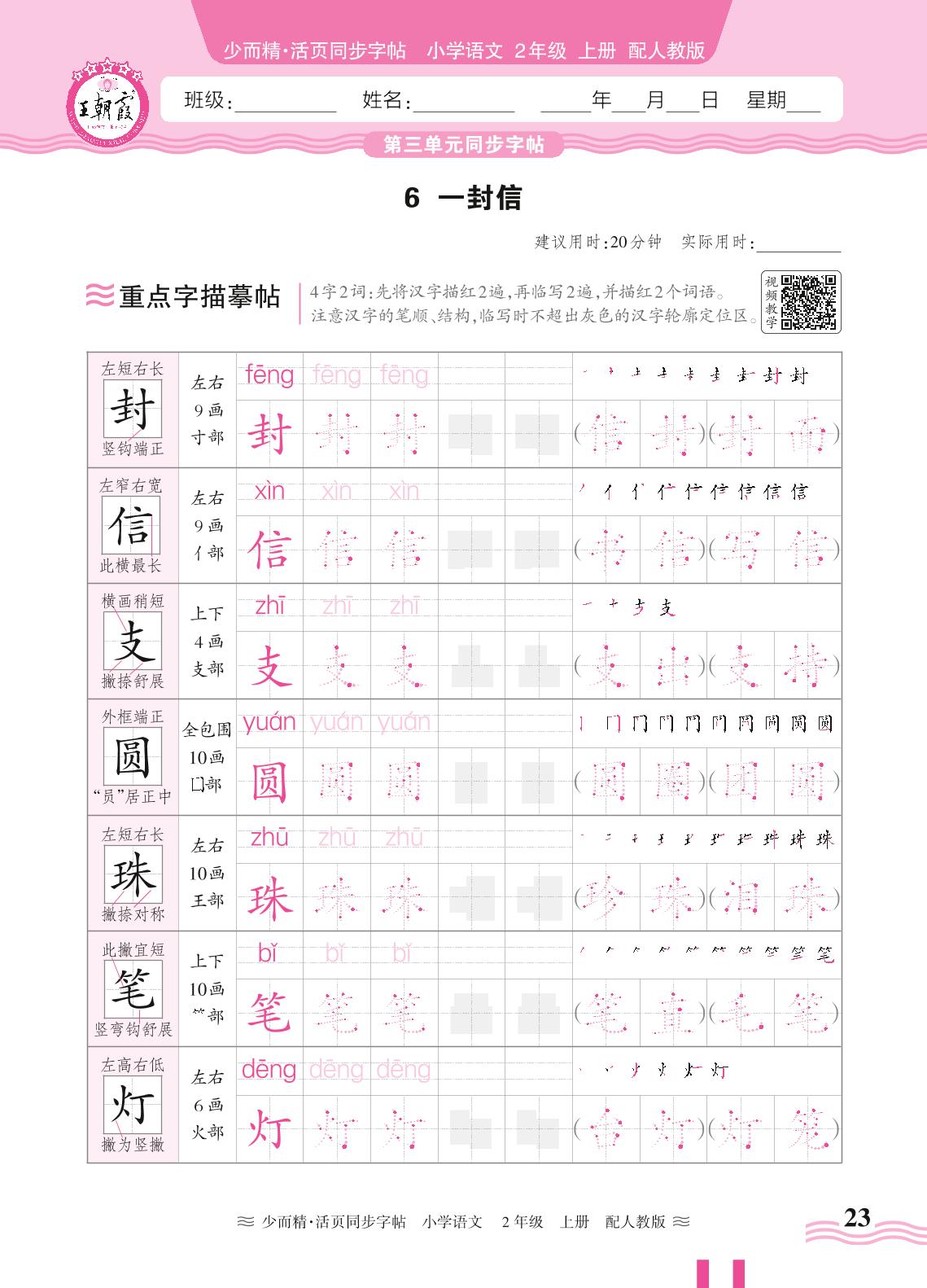2024秋上册二年级语文人教版 第三单元同步字帖——6. 一封信