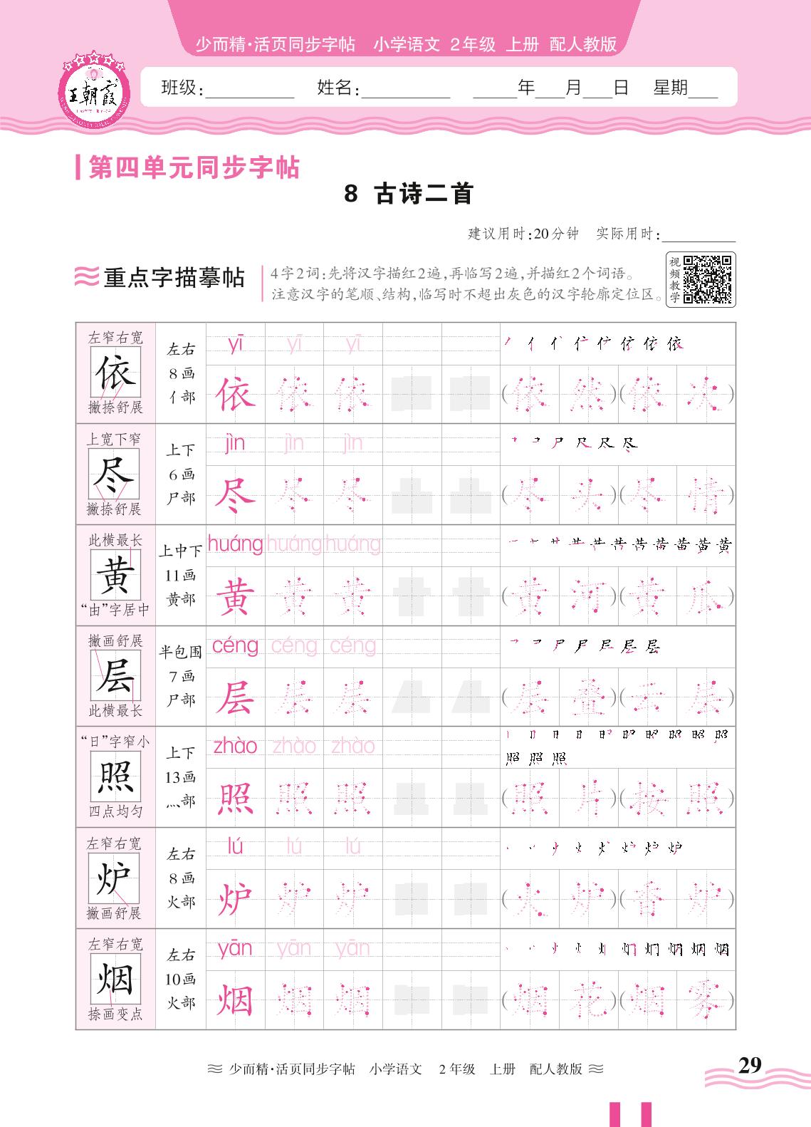 2024秋上册二年级语文人教版 第四单元同步字帖——8. 古诗二首