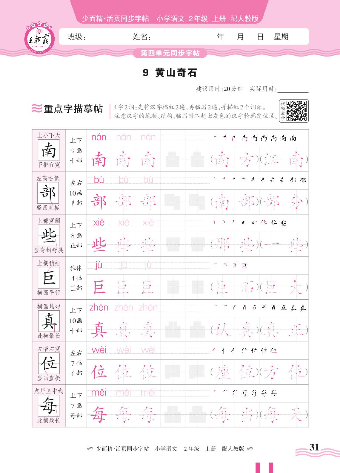 2024秋上册二年级语文人教版 第四单元同步字帖——9. 黄山奇石
