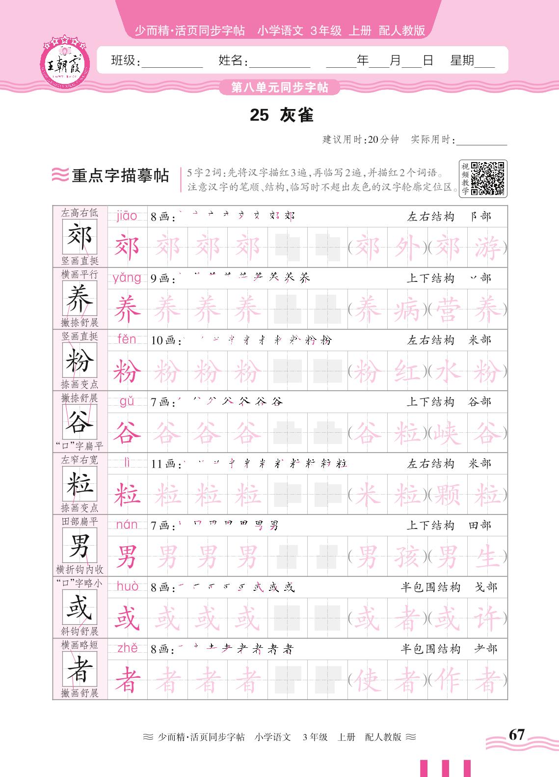 2024秋上册三年级语文人教版 第八单元同步字帖——25. 灰雀