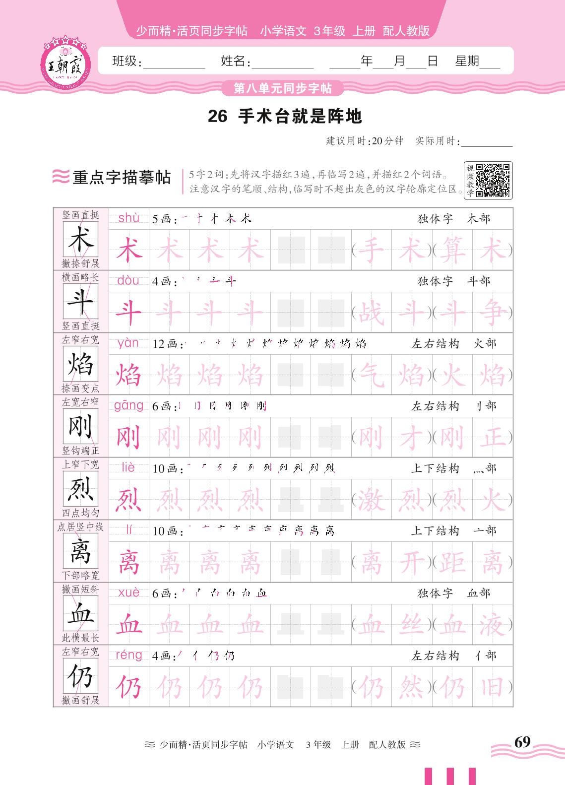 2024秋上册三年级语文人教版 第八单元同步字帖——26. 手术台就是阵地