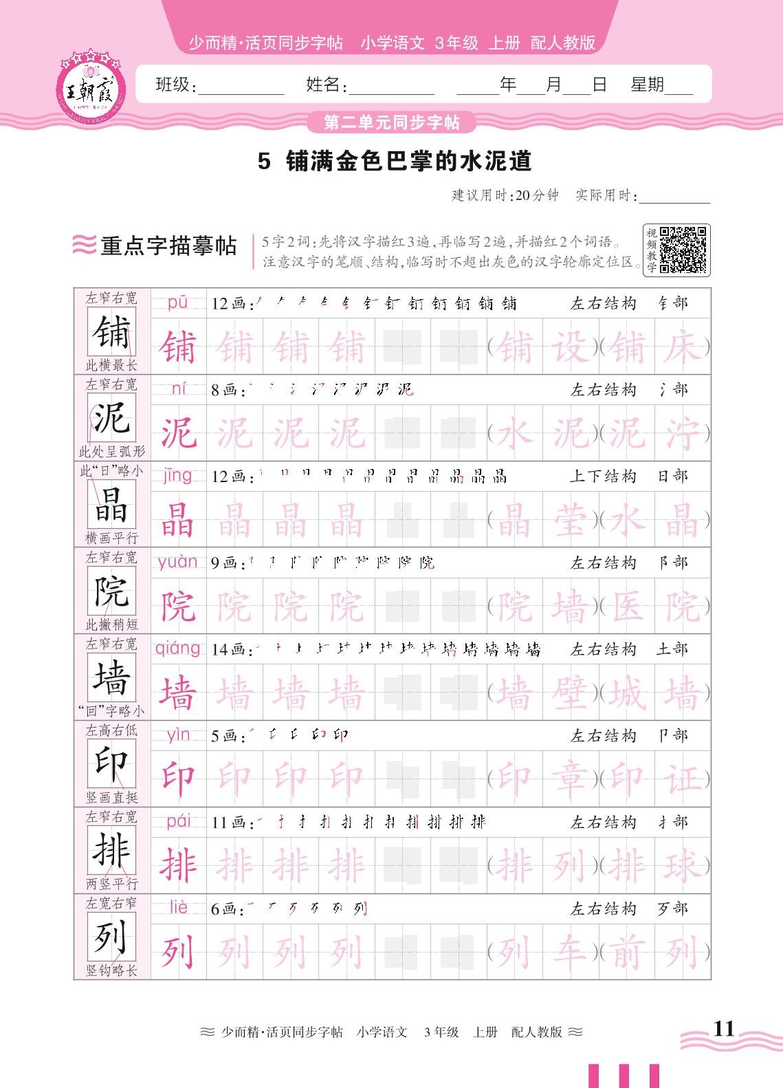 2024秋上册三年级语文人教版 第二单元同步字帖——5. 铺满金色巴掌的水泥道