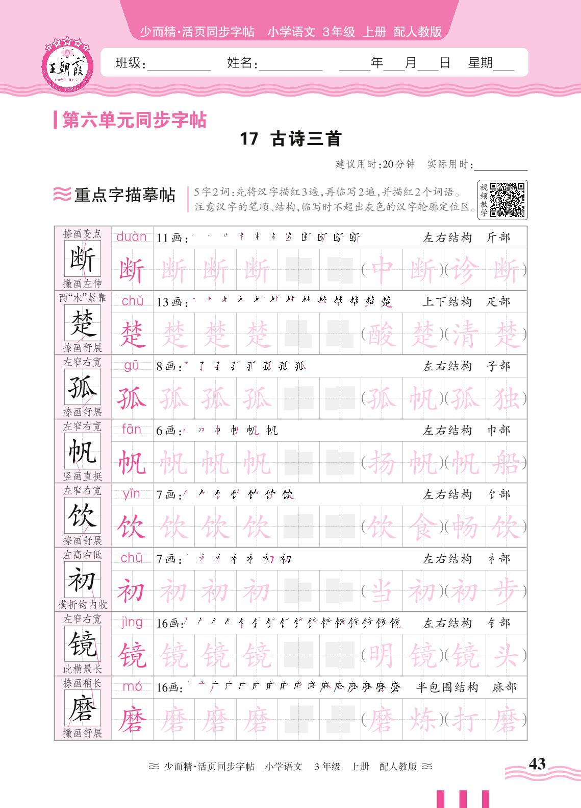2024秋上册三年级语文人教版 第六单元同步字帖——17. 古诗三首