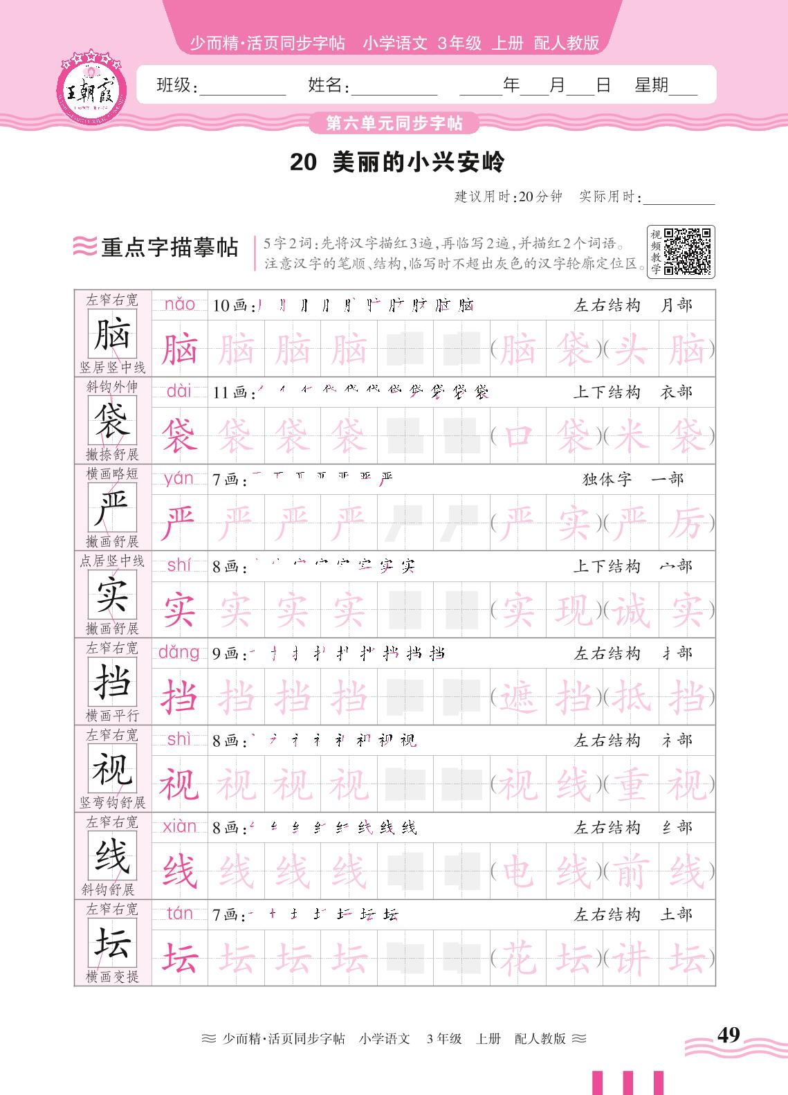2024秋上册三年级语文人教版 第六单元同步字帖——20. 美丽的小兴安岭
