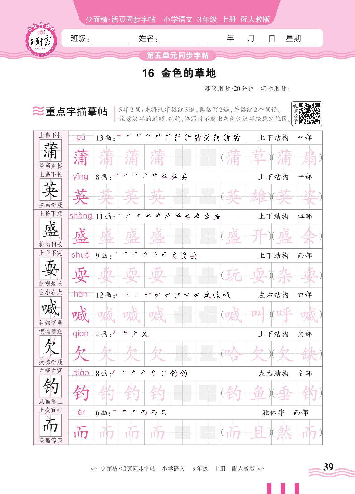 2024秋上册三年级语文人教版 第五单元同步字帖——16. 金色的草地
