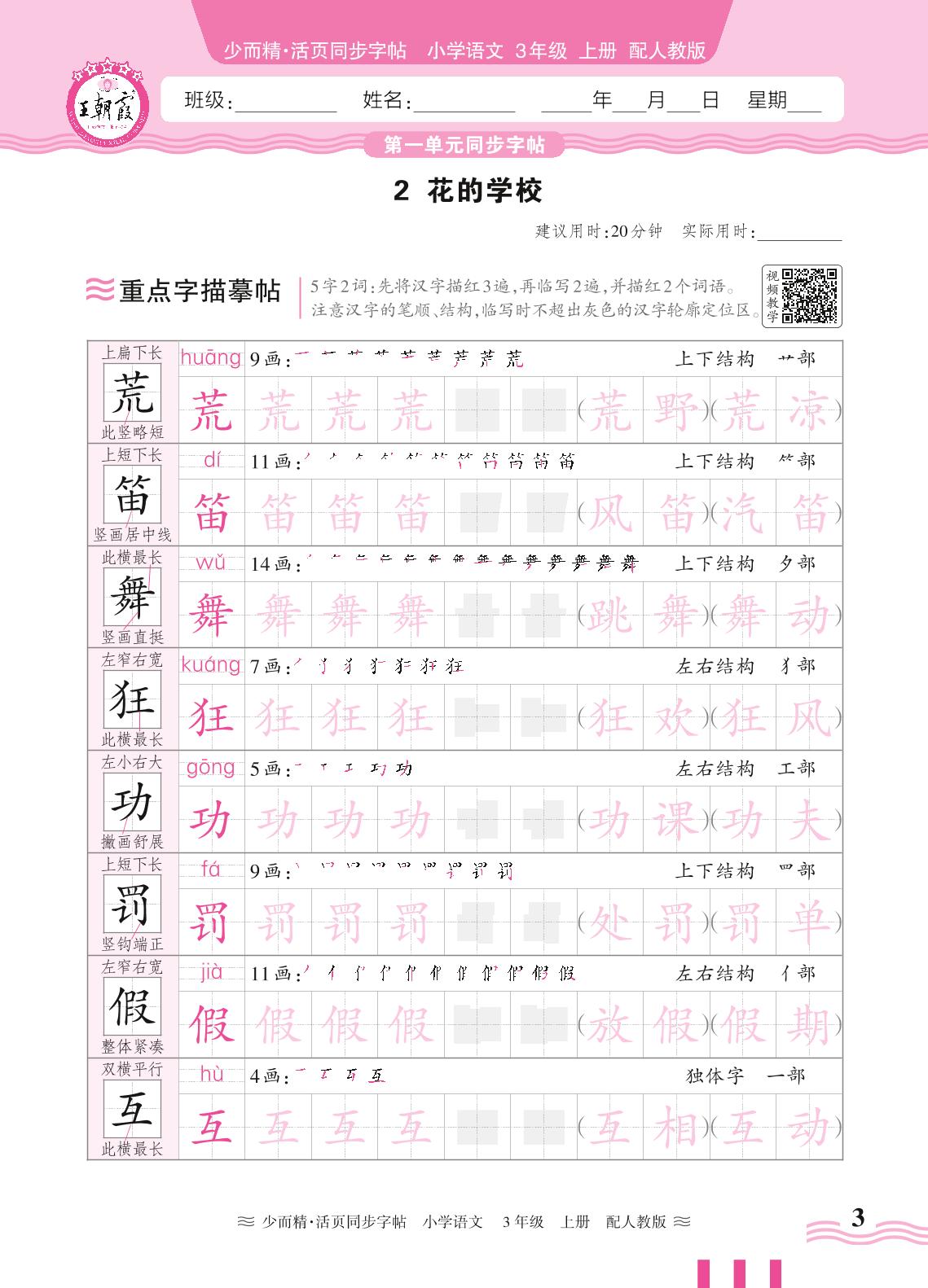 2024秋上册三年级语文人教版 第一单元同步字帖——2. 花的学校