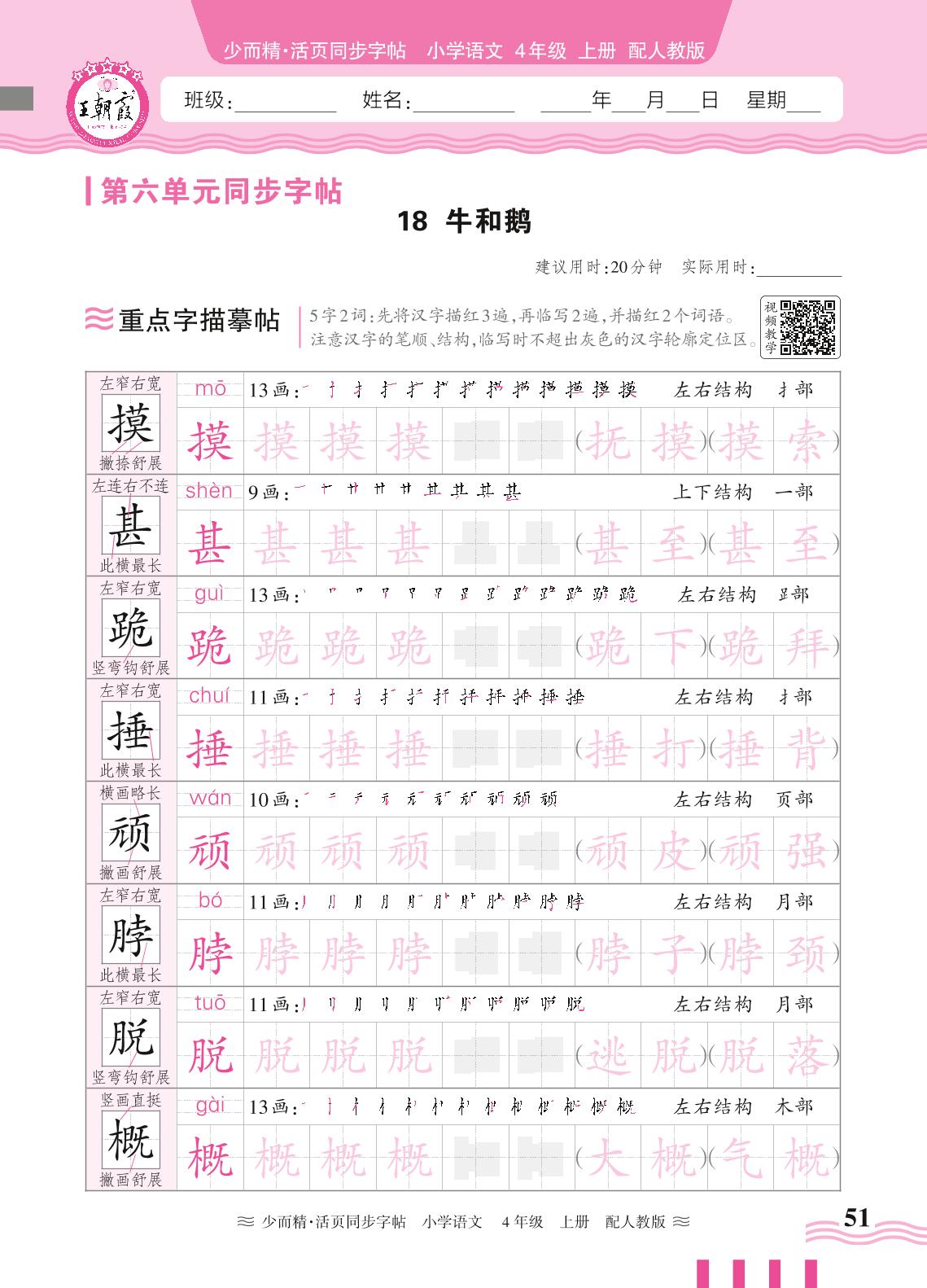 2024秋上册四年级语文人教版 第六单元同步字帖——18. 牛和鹅