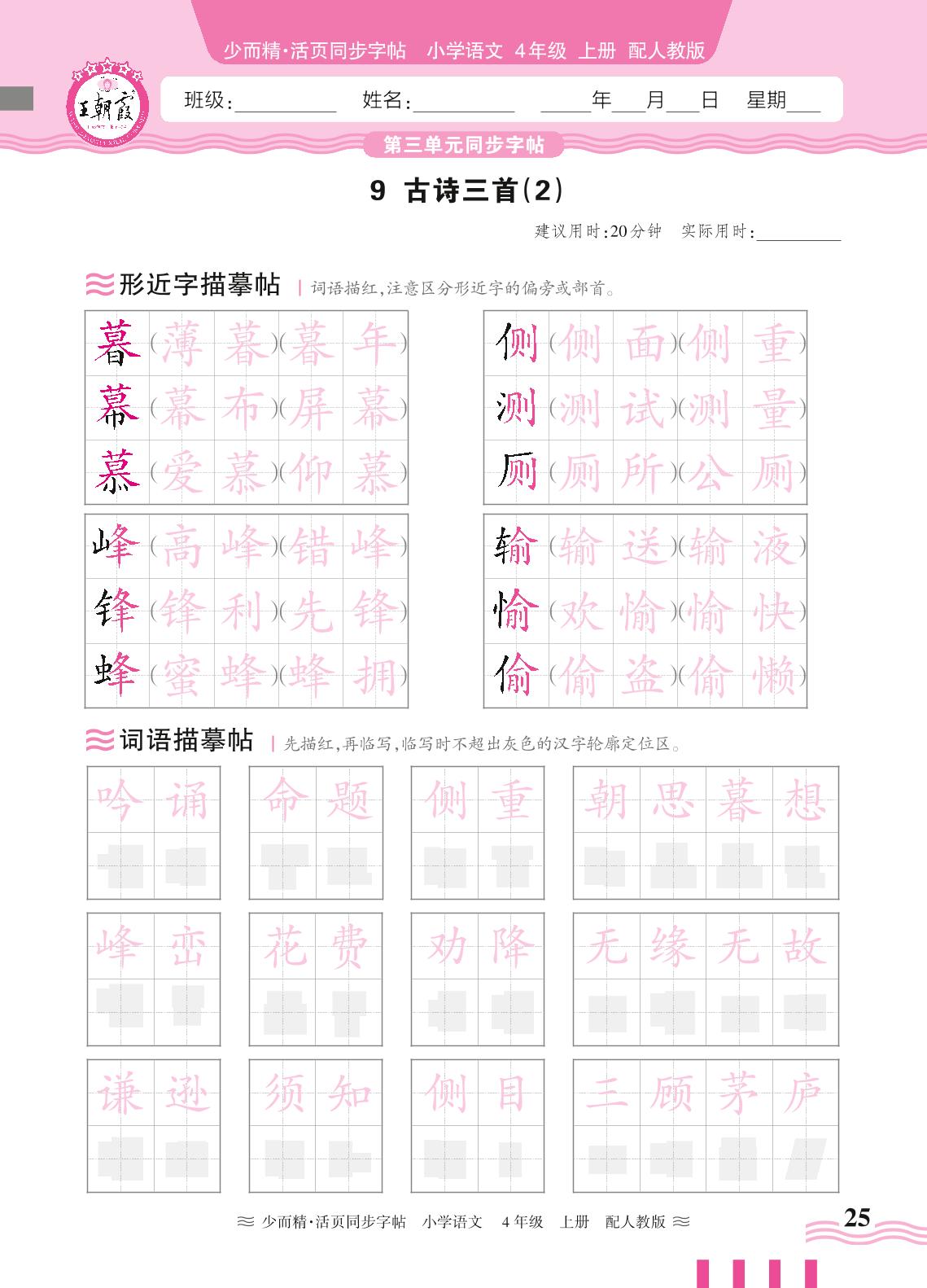 2024秋上册四年级语文人教版 第三单元同步字帖——9. 古诗三首(2)