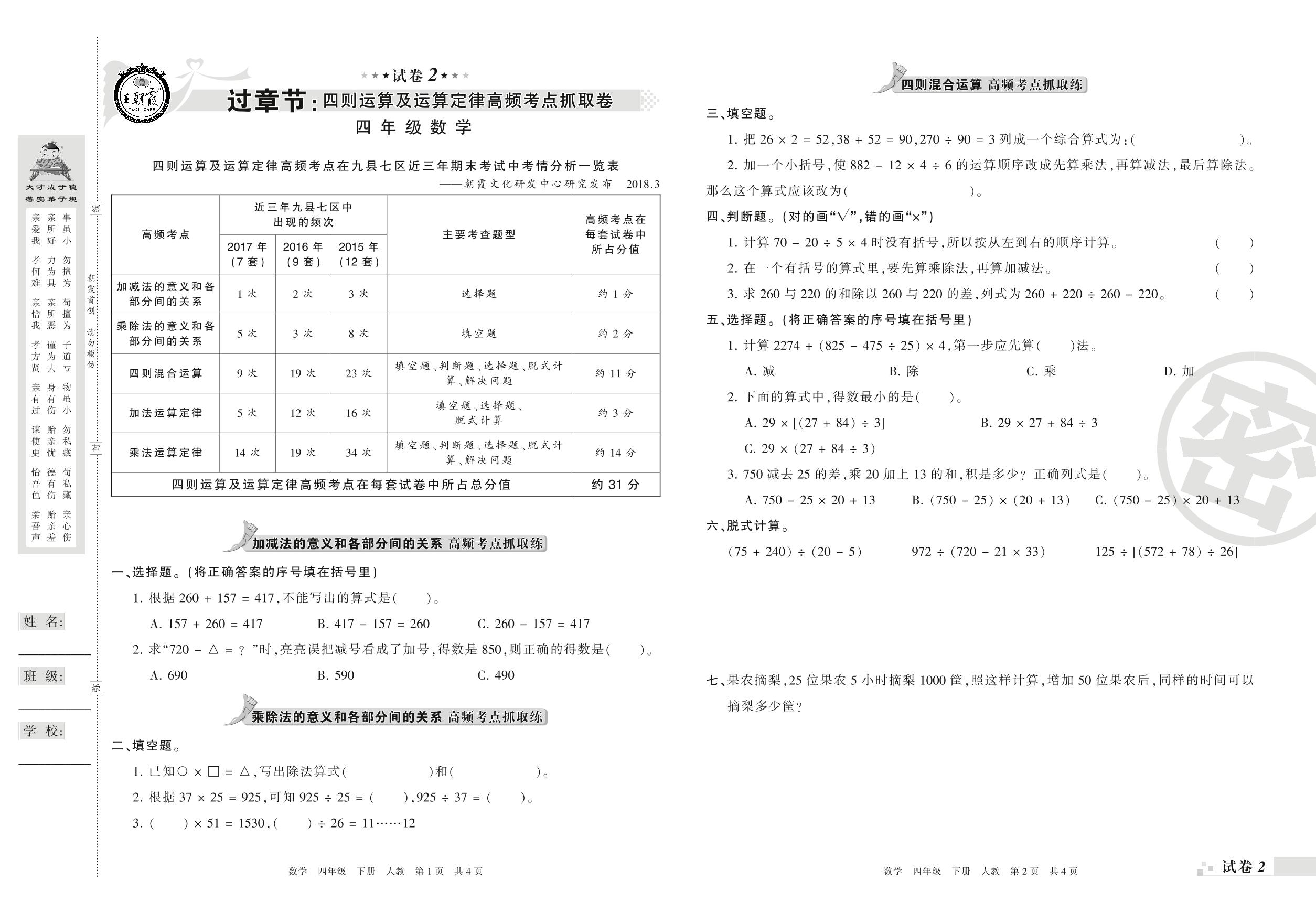 王朝霞期末过章节——四则运算及运算定律高频考点抓取卷四年级下册数学(人教版)_R210804161343【2】