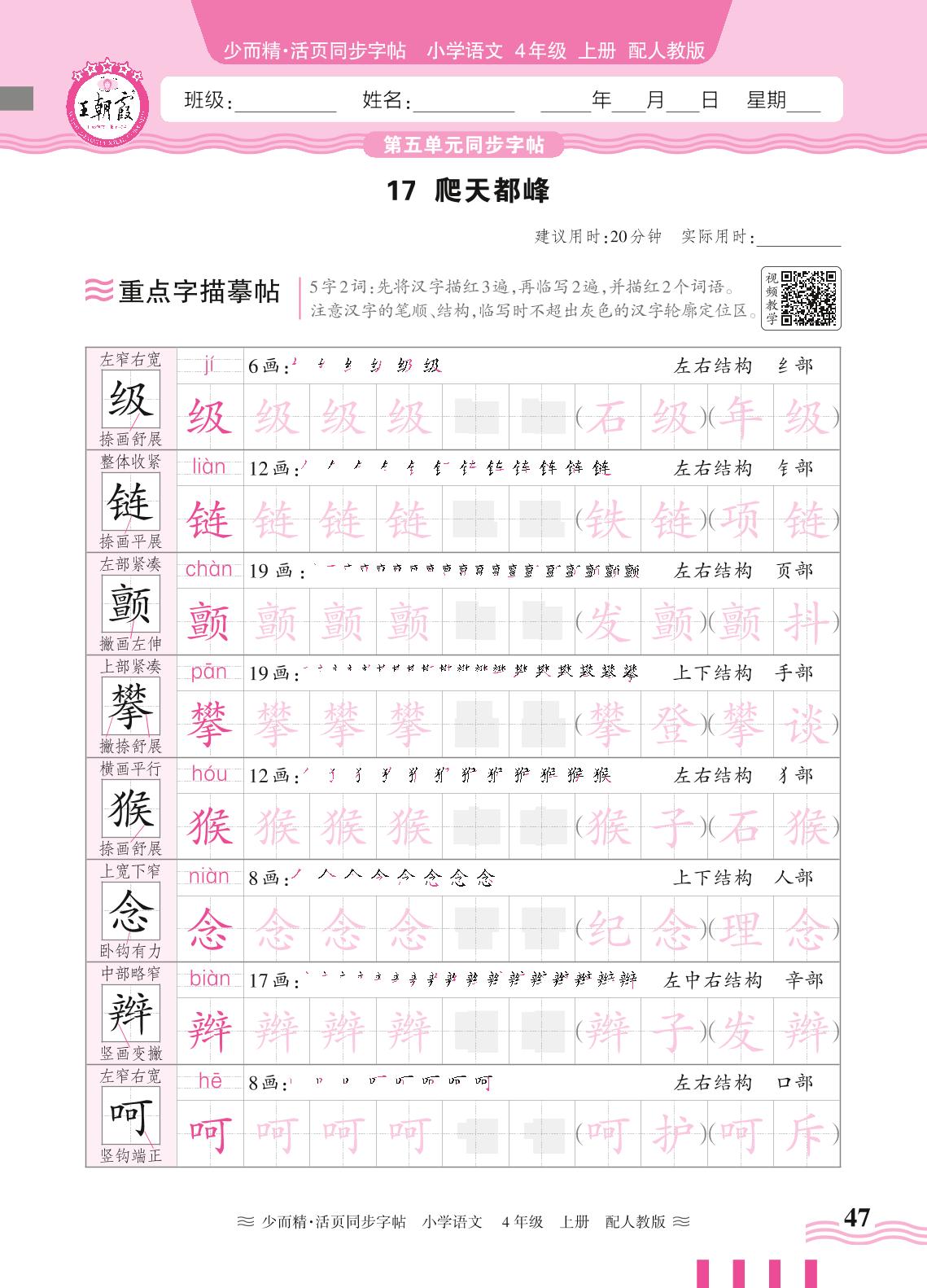 2024秋上册四年级语文人教版 第五单元同步字帖——17. 爬天都峰