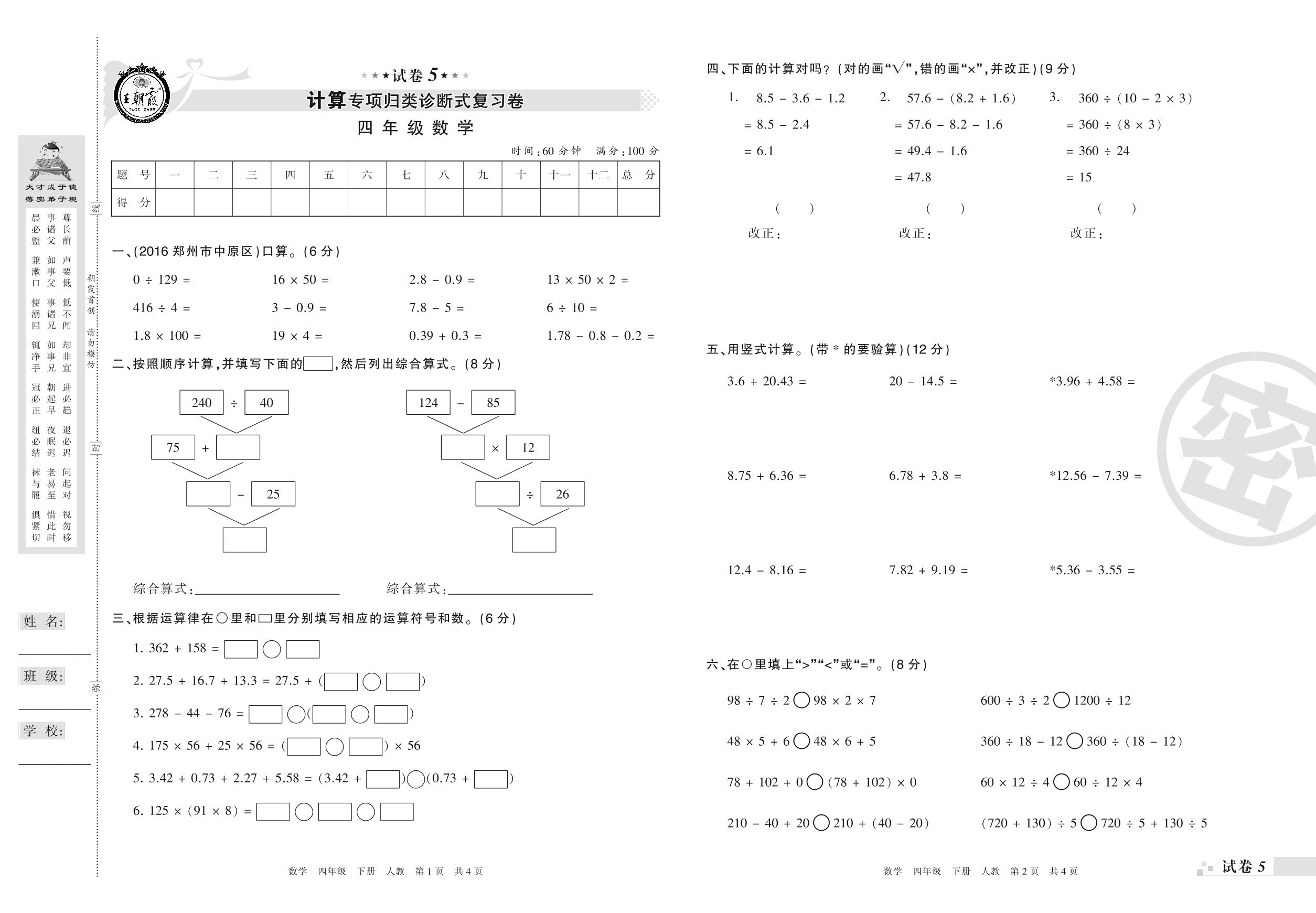 王朝霞期末专项卷——计算专项归类诊断式复习卷四年级下册数学(人教版)_R210804161350【5】