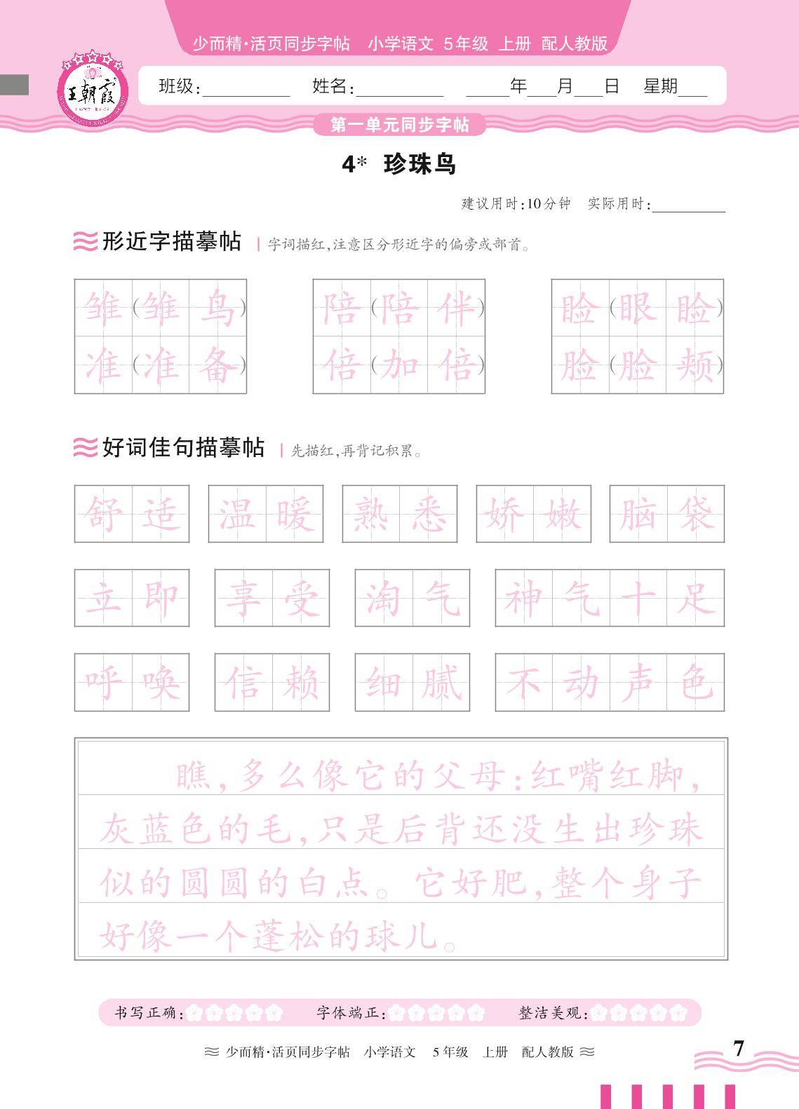 2024秋上册五年级语文人教版 第一单元同步字帖——4. 珍珠鸟