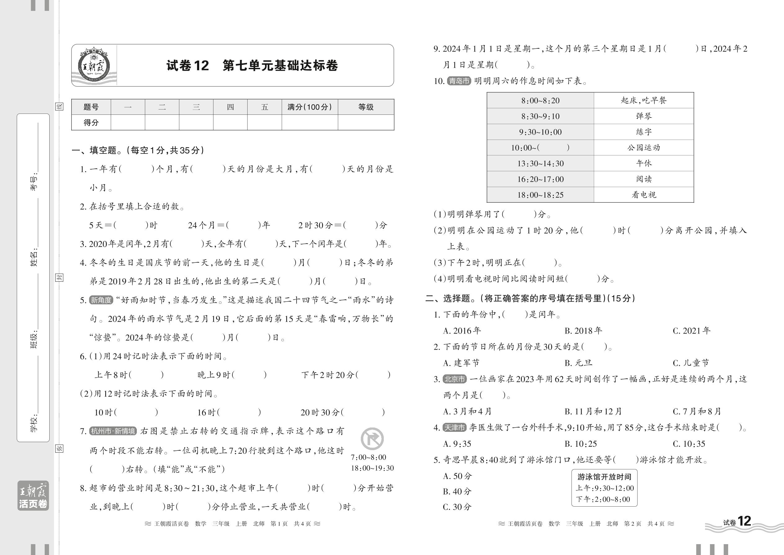 2024秋上册三年级数学北师版 第七单元基础达标卷【12】