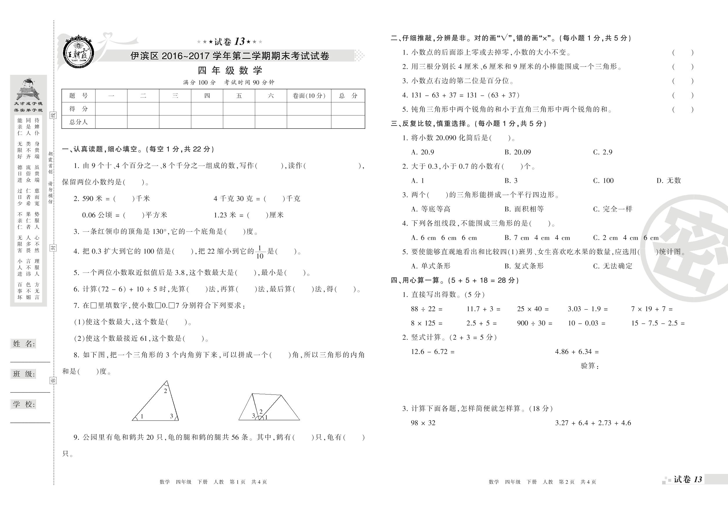 2016-2017学年第二学期洛阳市伊滨区四年级数学试卷(人教版)【13】