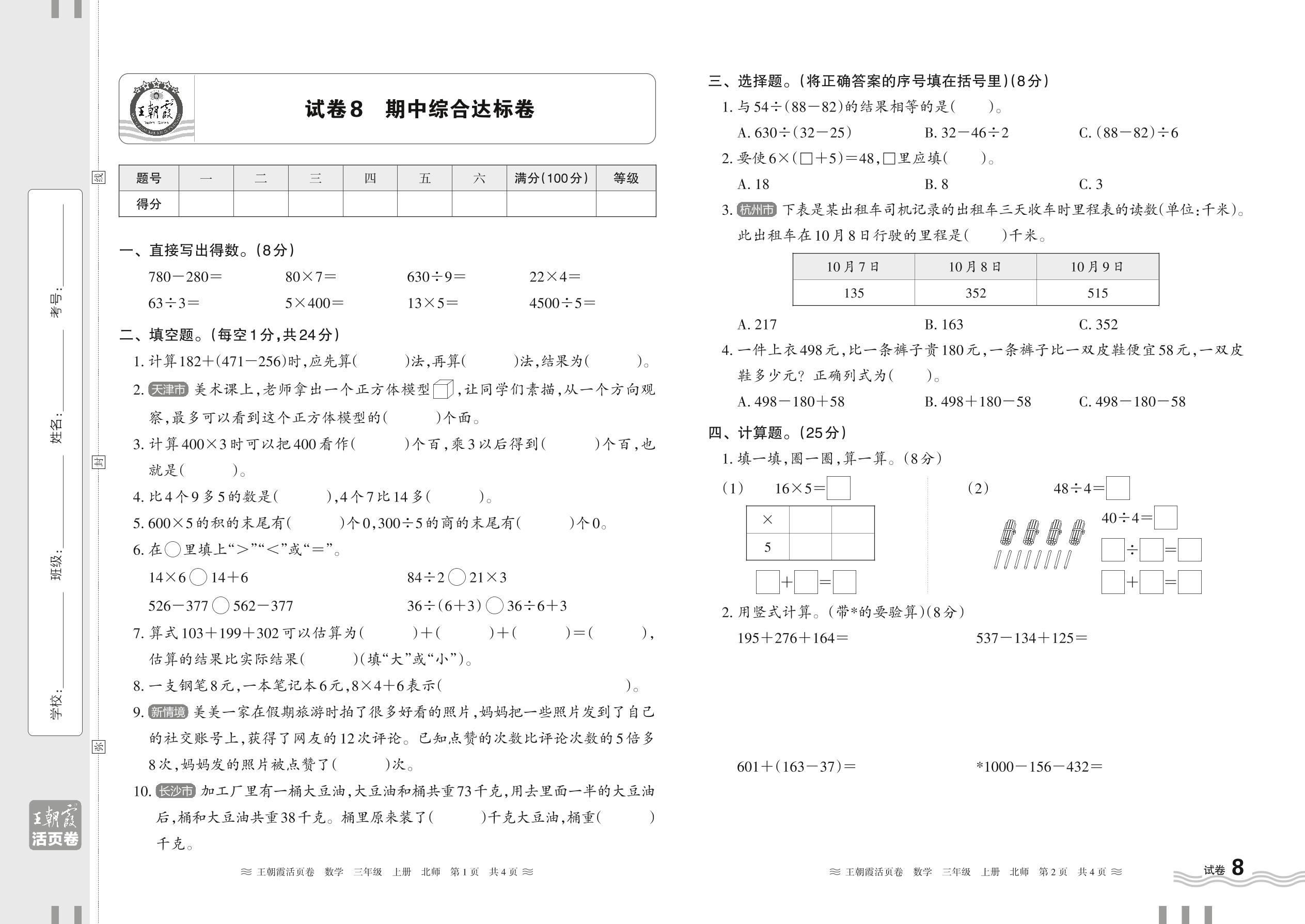 2024秋上册三年级数学北师版 期中综合达标卷【8】