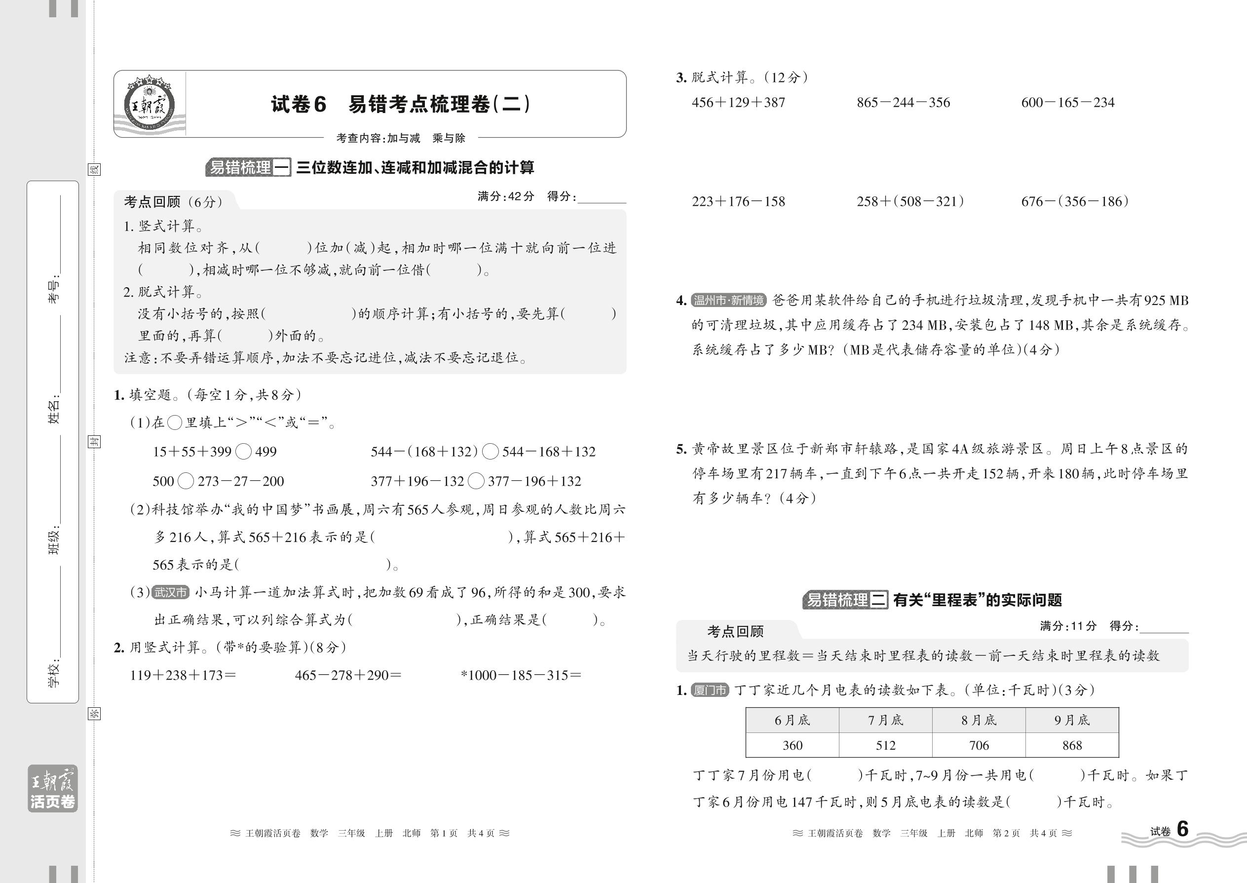 2024秋上册三年级数学北师版 易错考点梳理卷——加与减 乘与除【6】