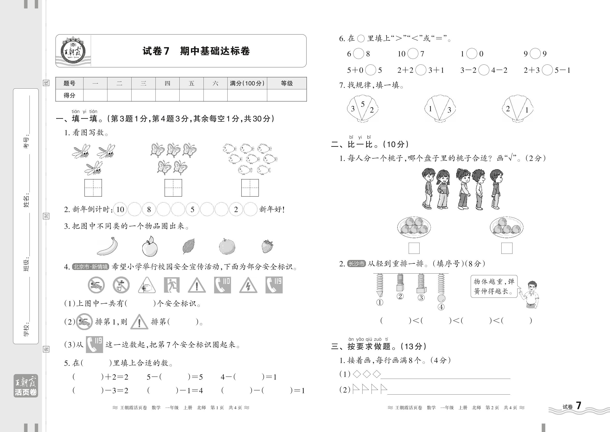 2024秋上册一年级数学北师版 期中基础达标卷【7】