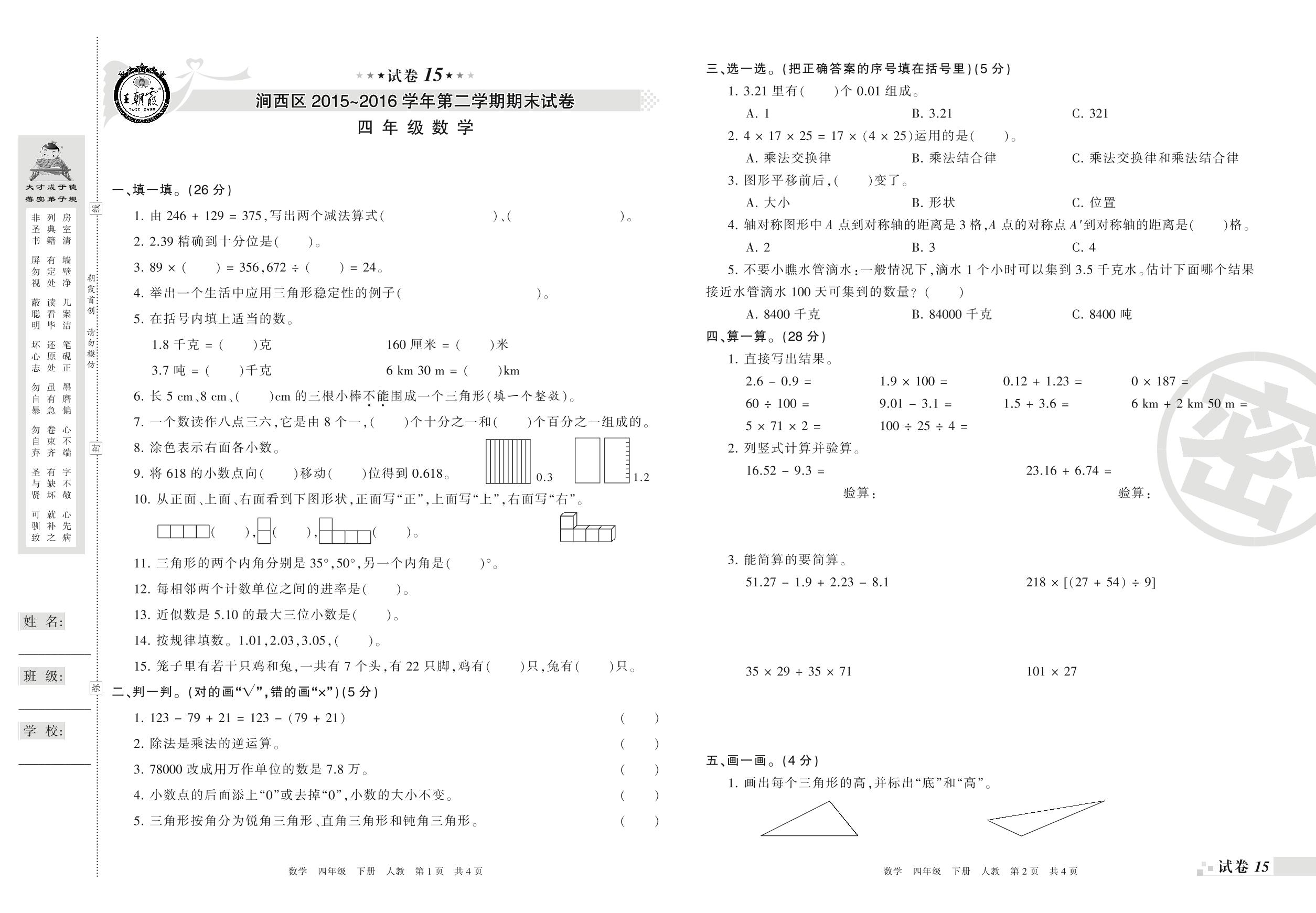 2015-2016学年第二学期洛阳市涧西区四年级数学试卷(人教版)【15】