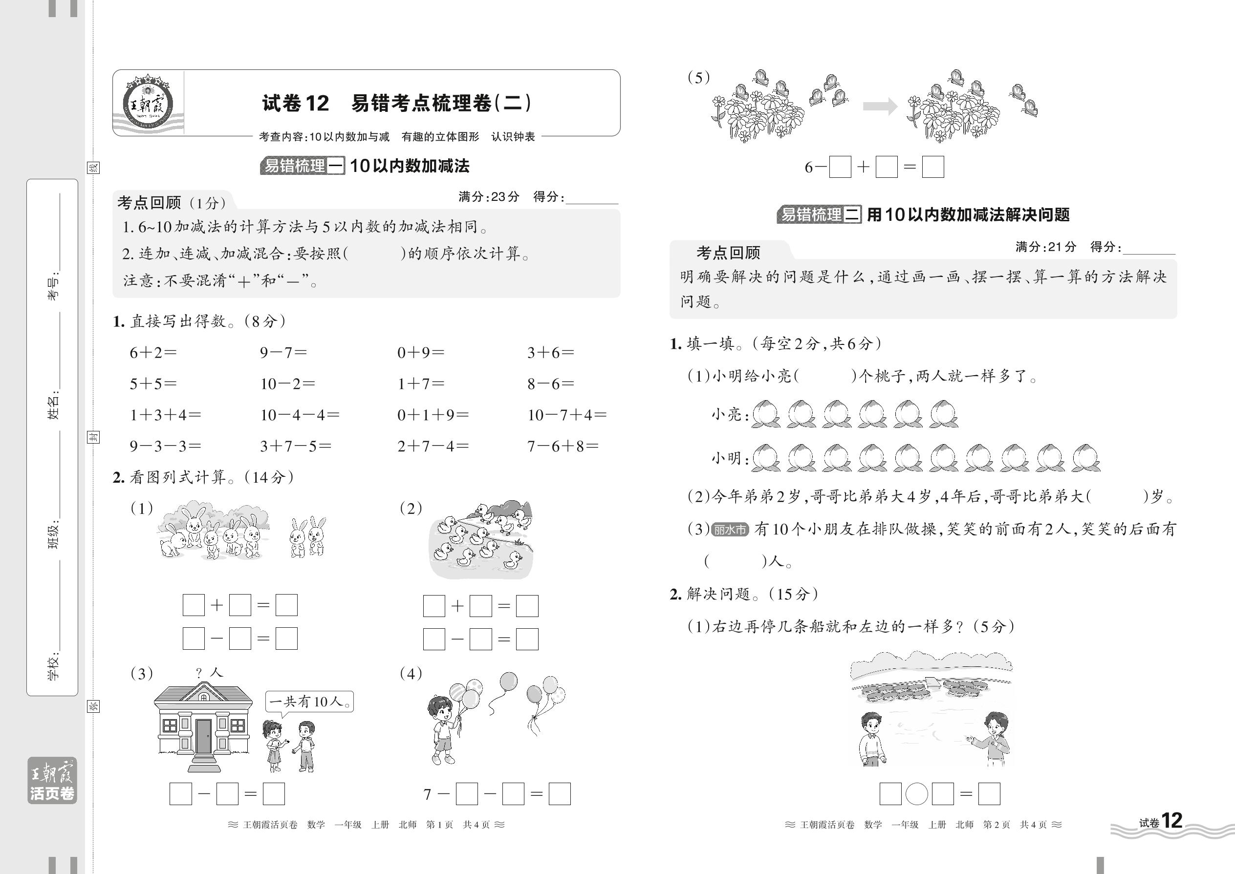 2024秋上册一年级数学北师版 易错考点梳理卷——10以内数加与减 有趣的立体图形 认识钟表【12】