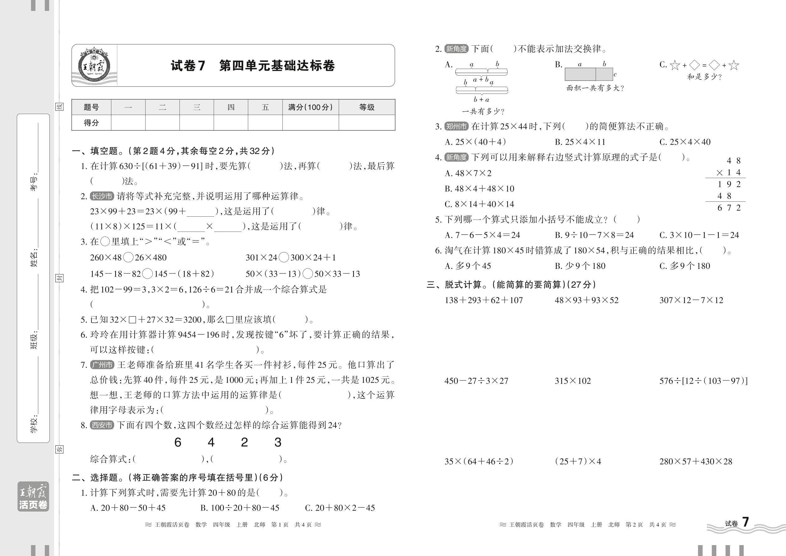2024秋上册四年级数学北师版 第四单元基础达标卷【7】