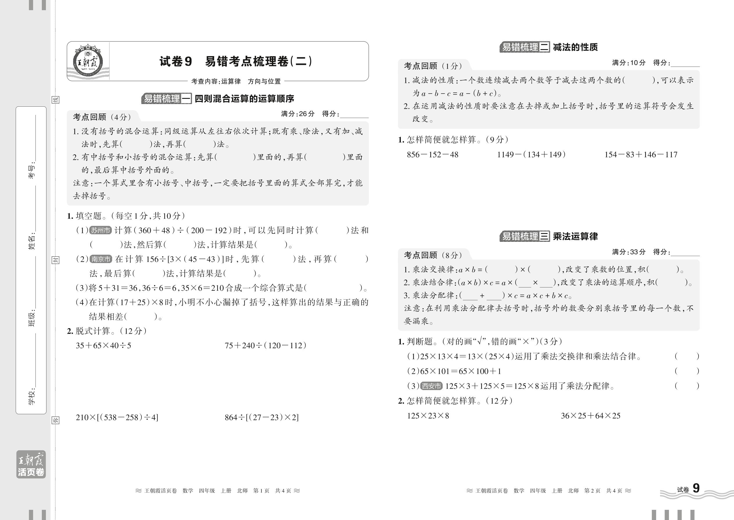 2024秋上册四年级数学北师版 易错考点梳理卷——运算律 方向与位置【9】