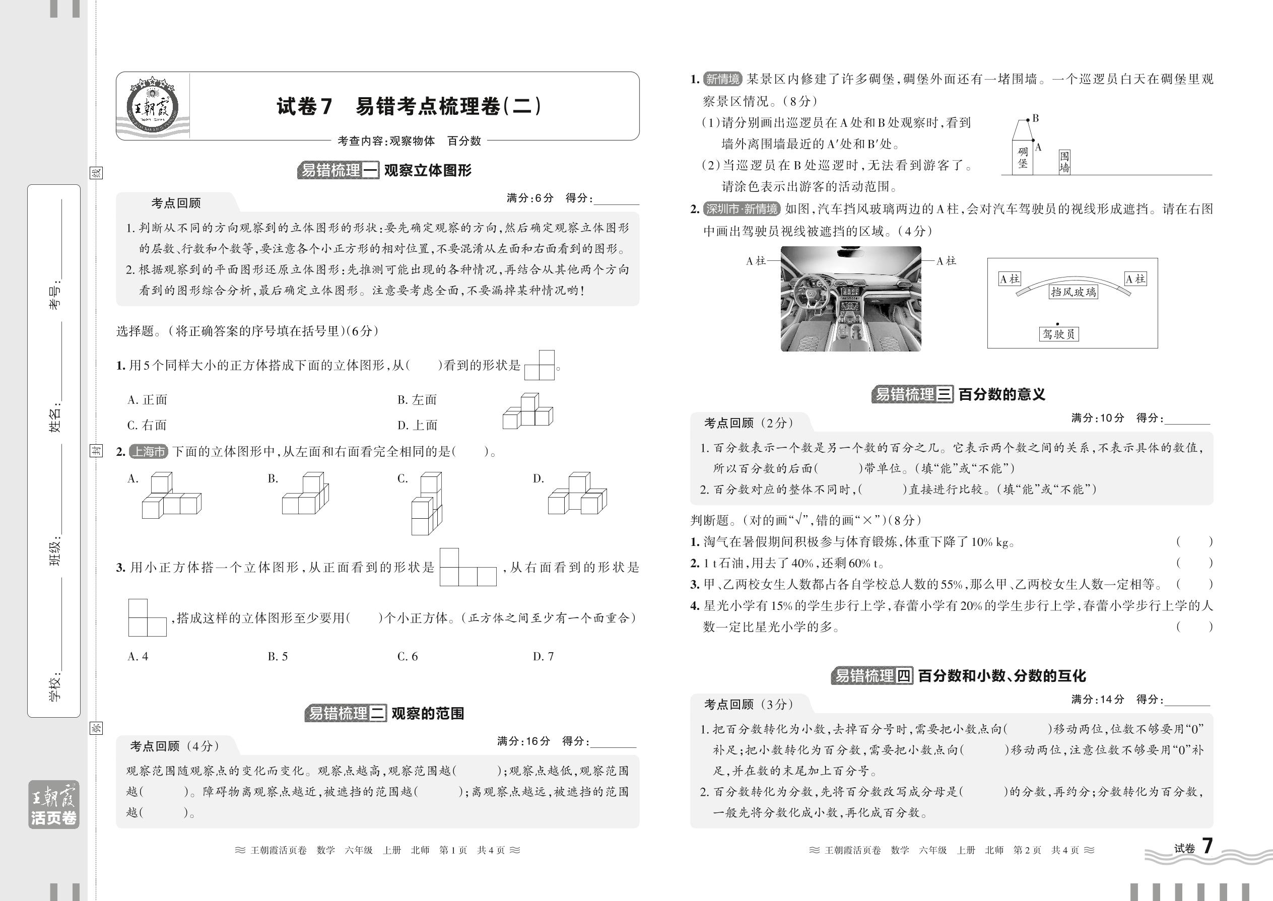 2024秋上册六年级数学北师版 易错考点梳理卷——观察物体 百分数【7】