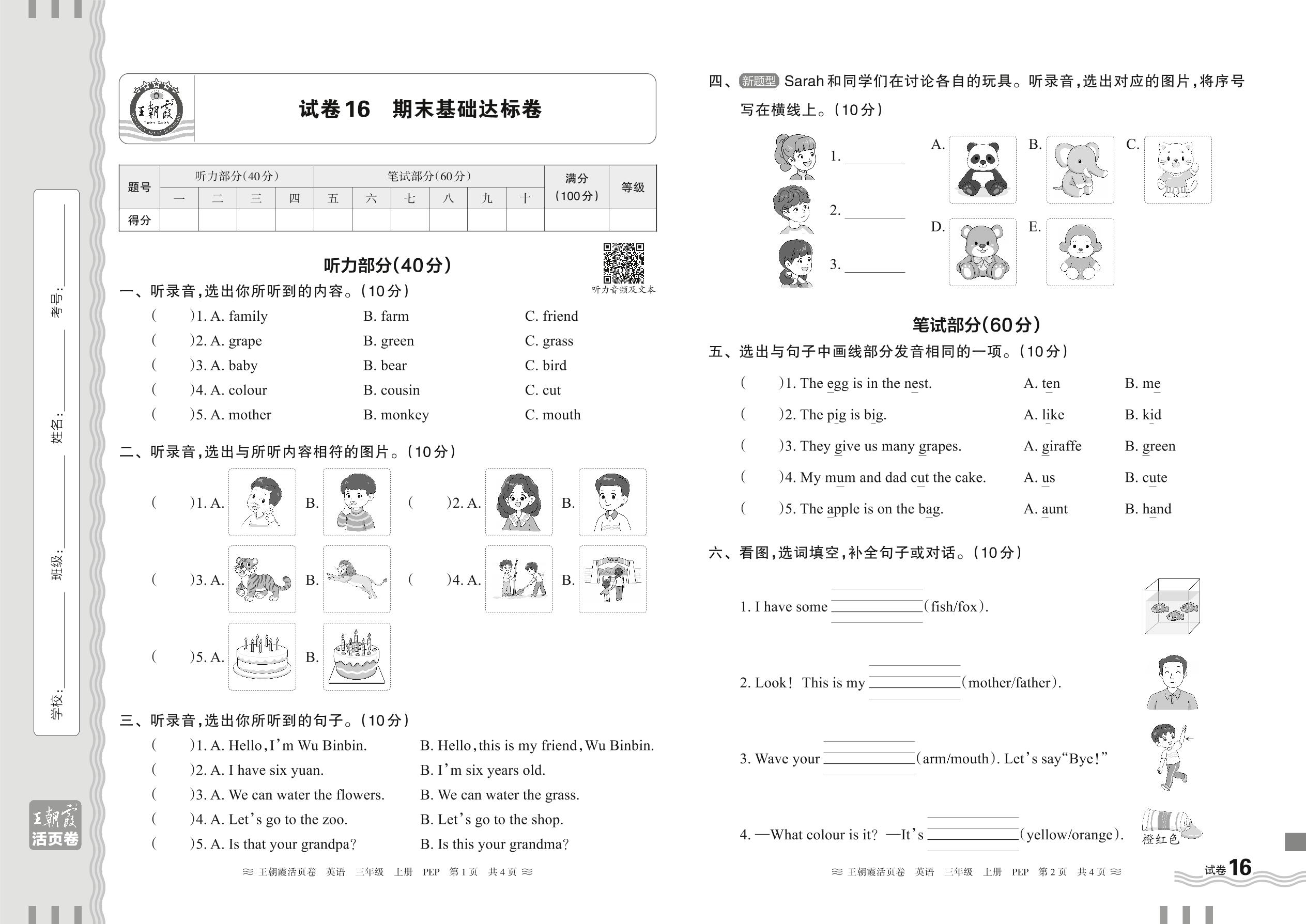 2024秋上册三年级英语人教PEP版(三起始) 期末基础达标卷【16】