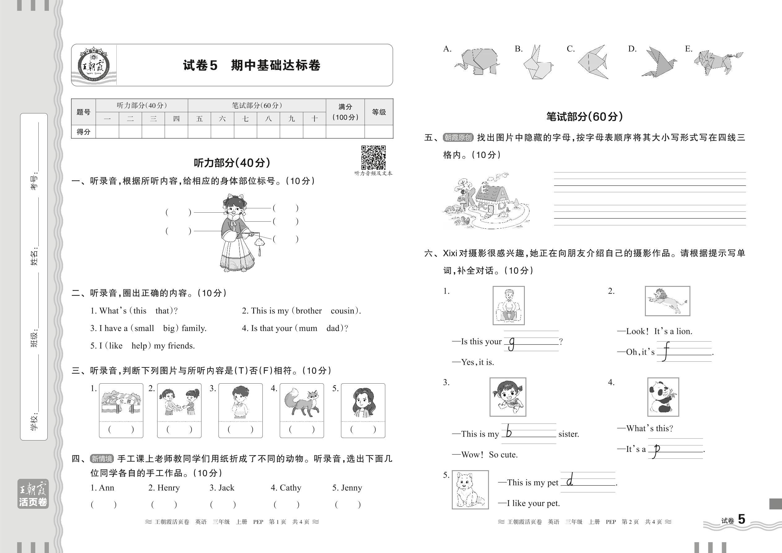 2024秋上册三年级英语人教PEP版(三起始) 期中基础达标卷【5】