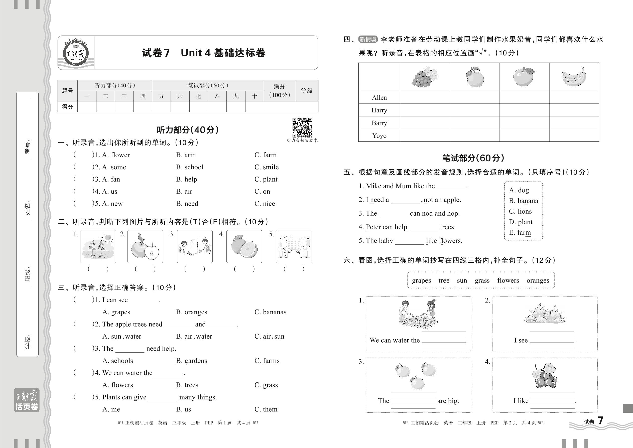 2024秋上册三年级英语人教PEP版(三起始) Unit 4 基础达标卷【7】