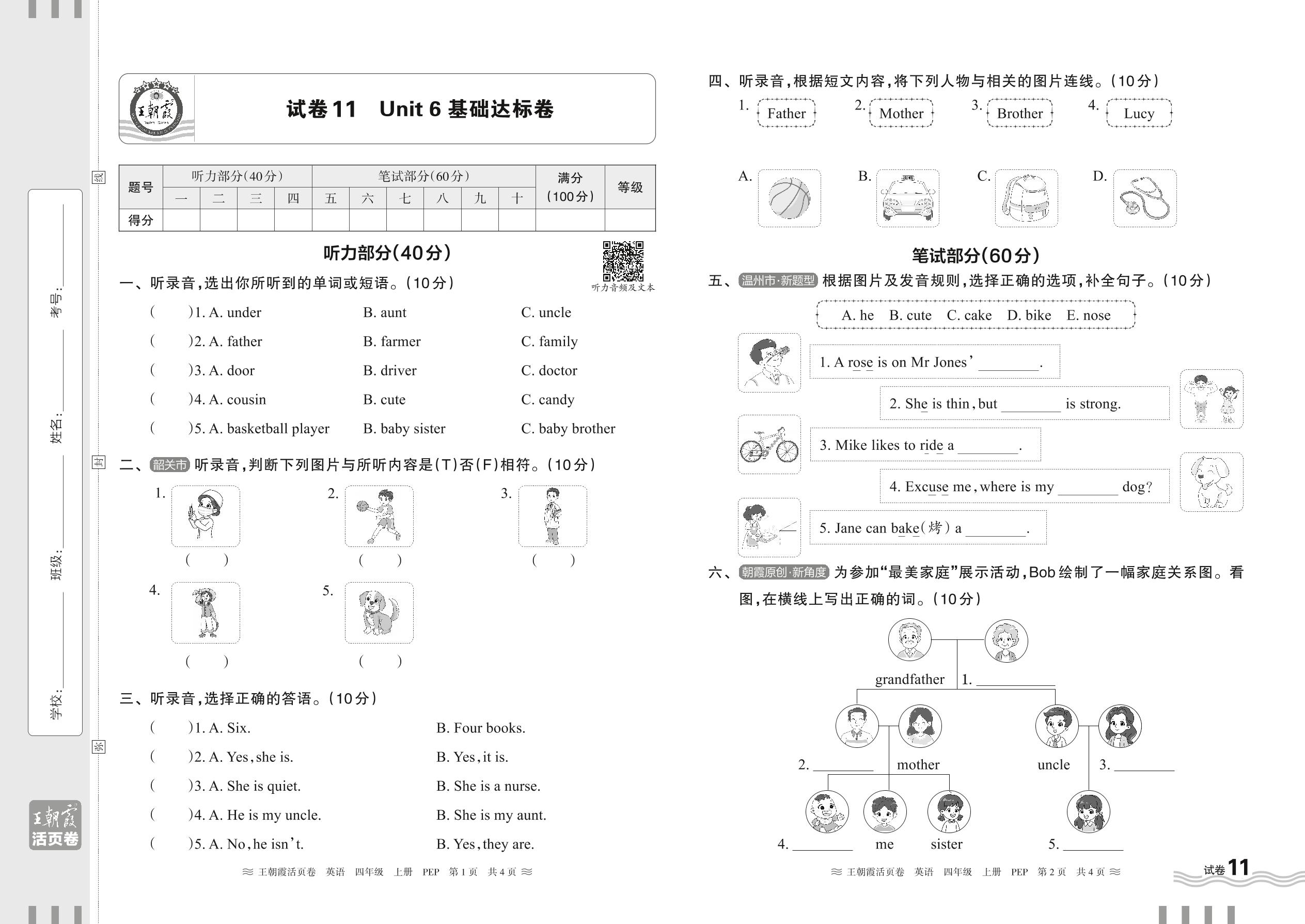 四年级英语人教PEP版(三起始)上册单元卷