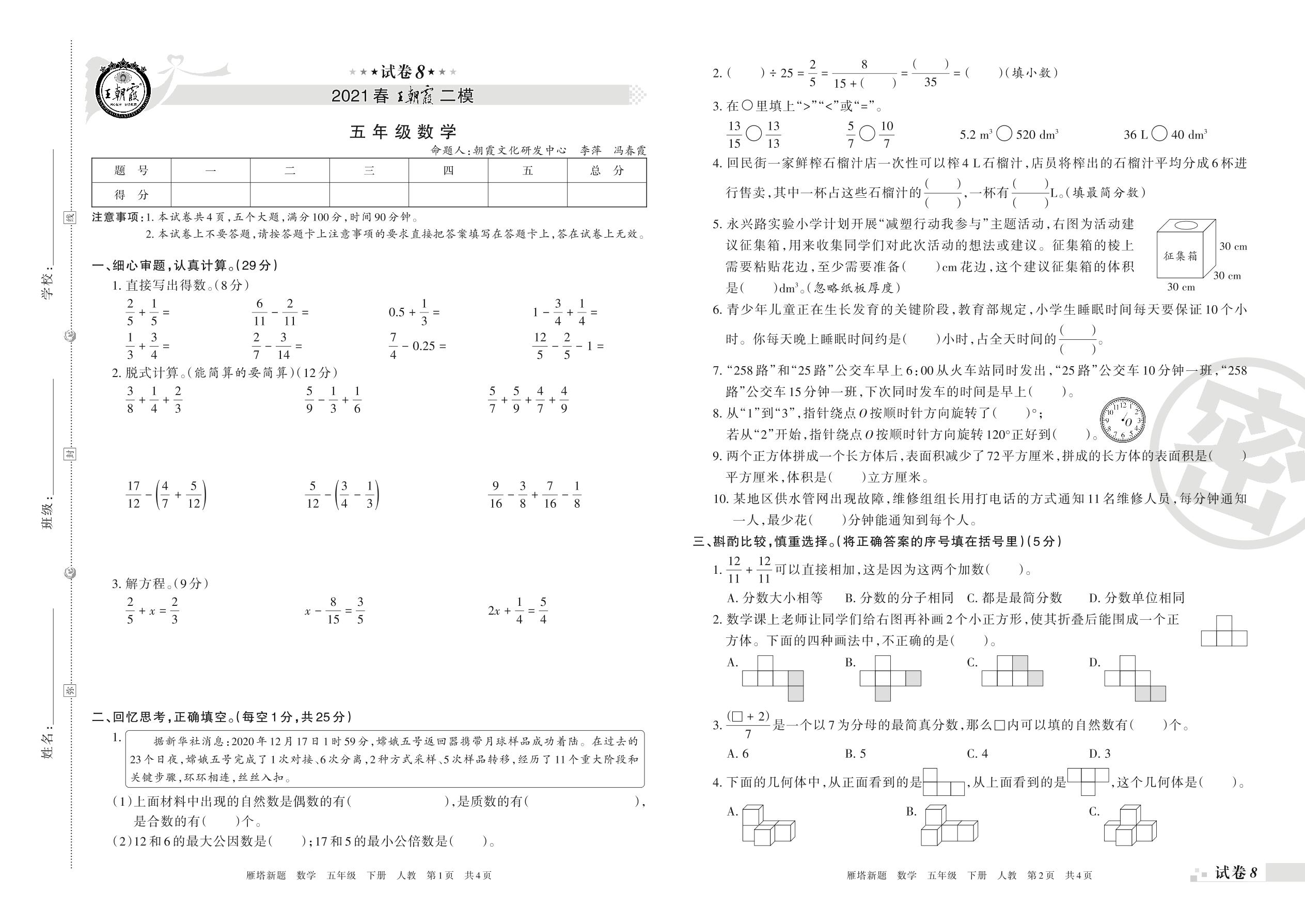 王朝霞期末模拟卷五年级下册数学(人教版)_R210804161721【8】