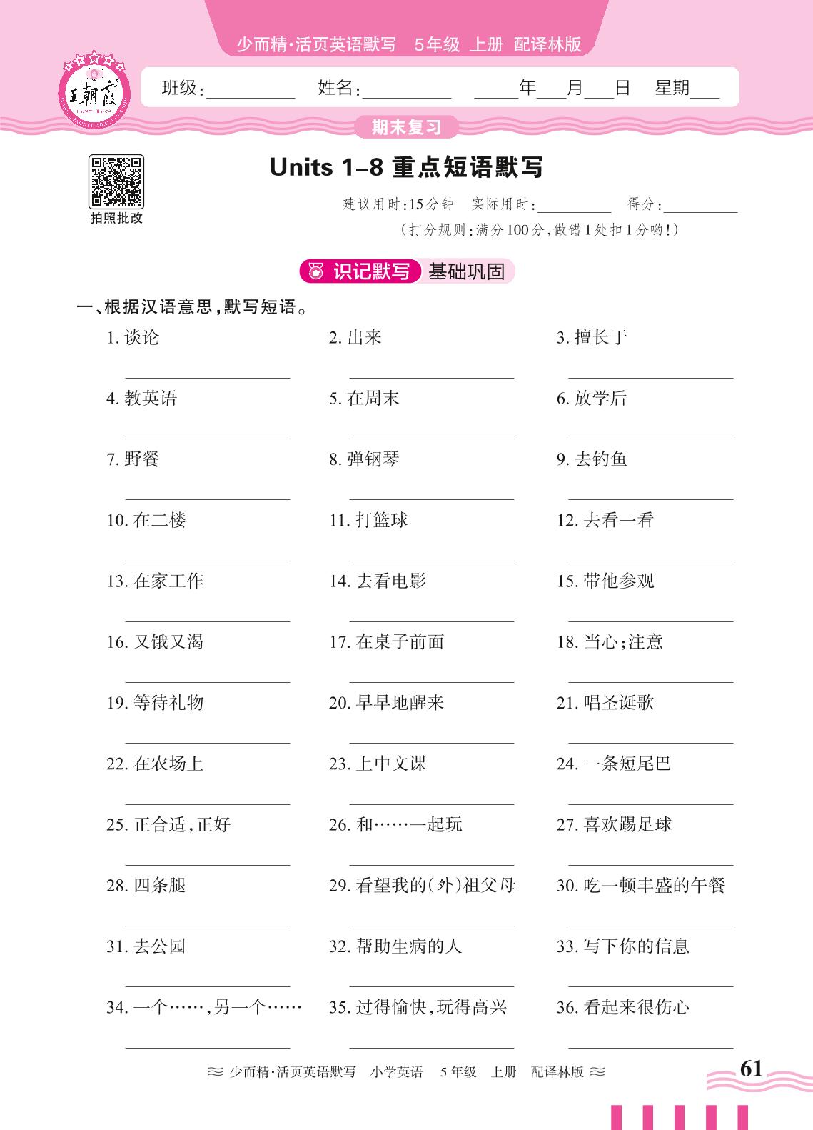 2024秋上册五年级英语译林版(三起始) 期末复习 Units 1-8 重点短语默写