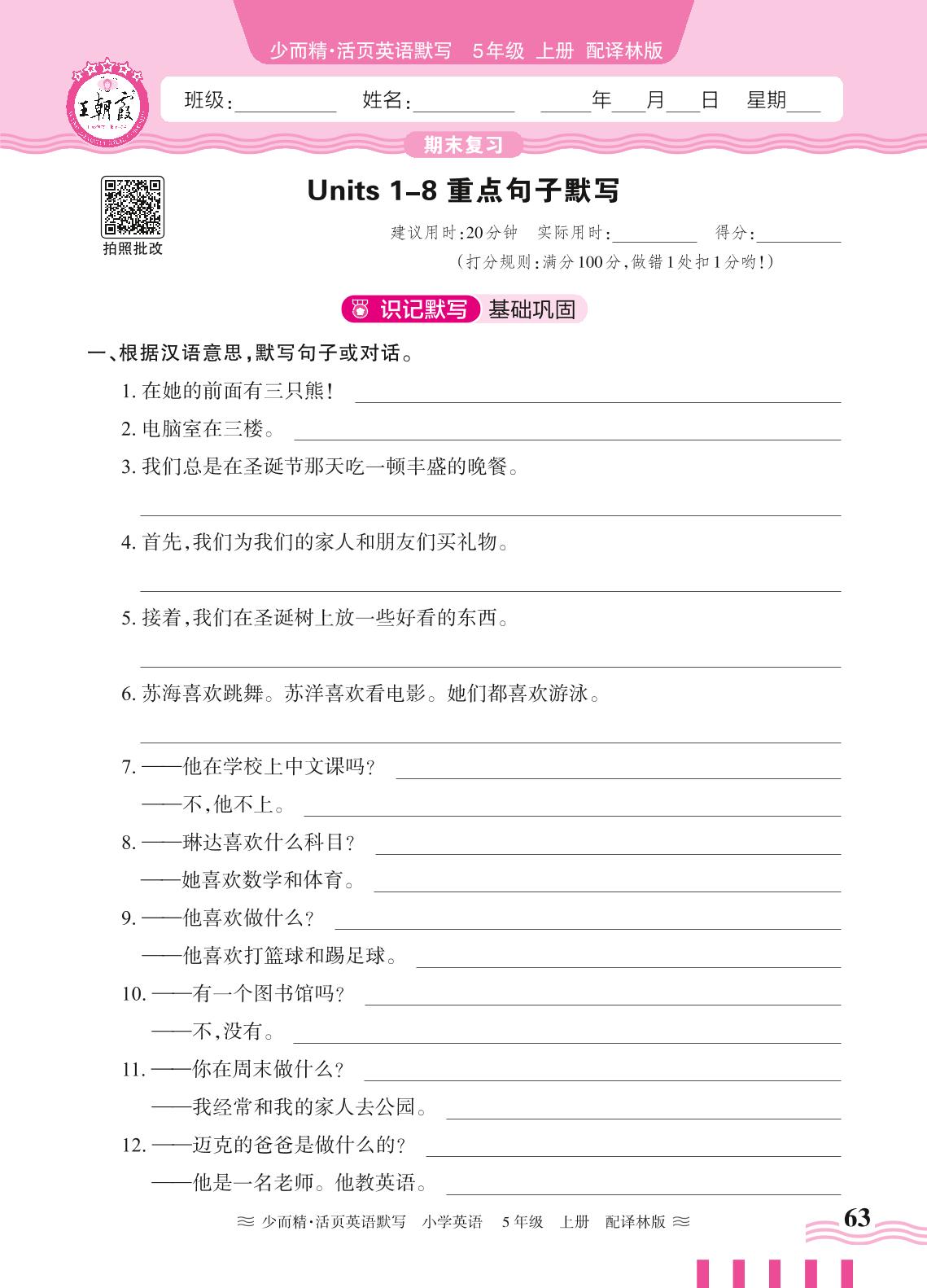 2024秋上册五年级英语译林版(三起始) 期末复习 Units 1-8 重点句子默写
