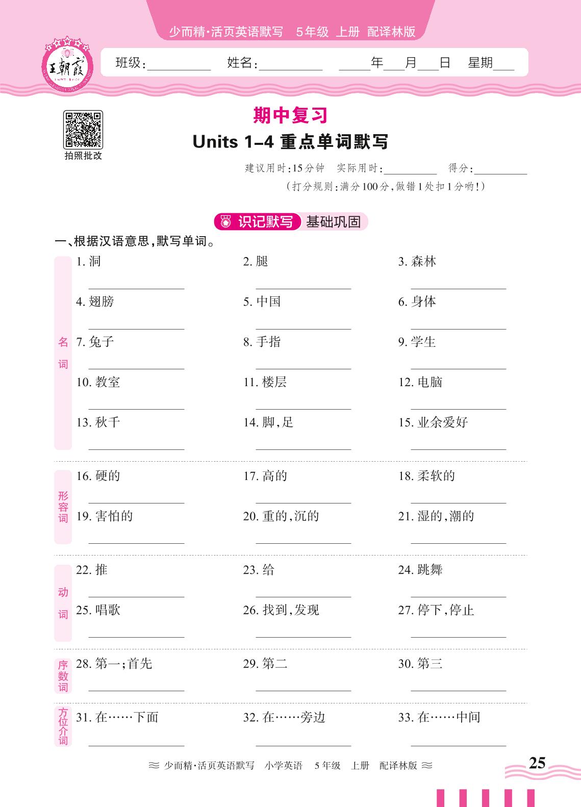 2024秋上册五年级英语译林版(三起始) 期中复习 Units 1-4 重点单词默写