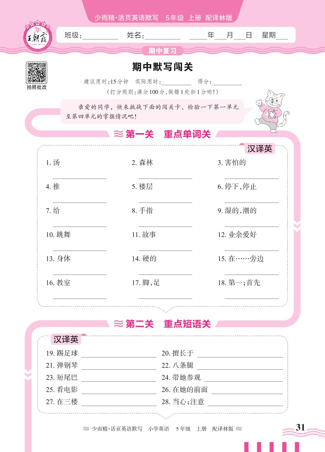 2024秋上册五年级英语译林版(三起始) 期中默写闯关