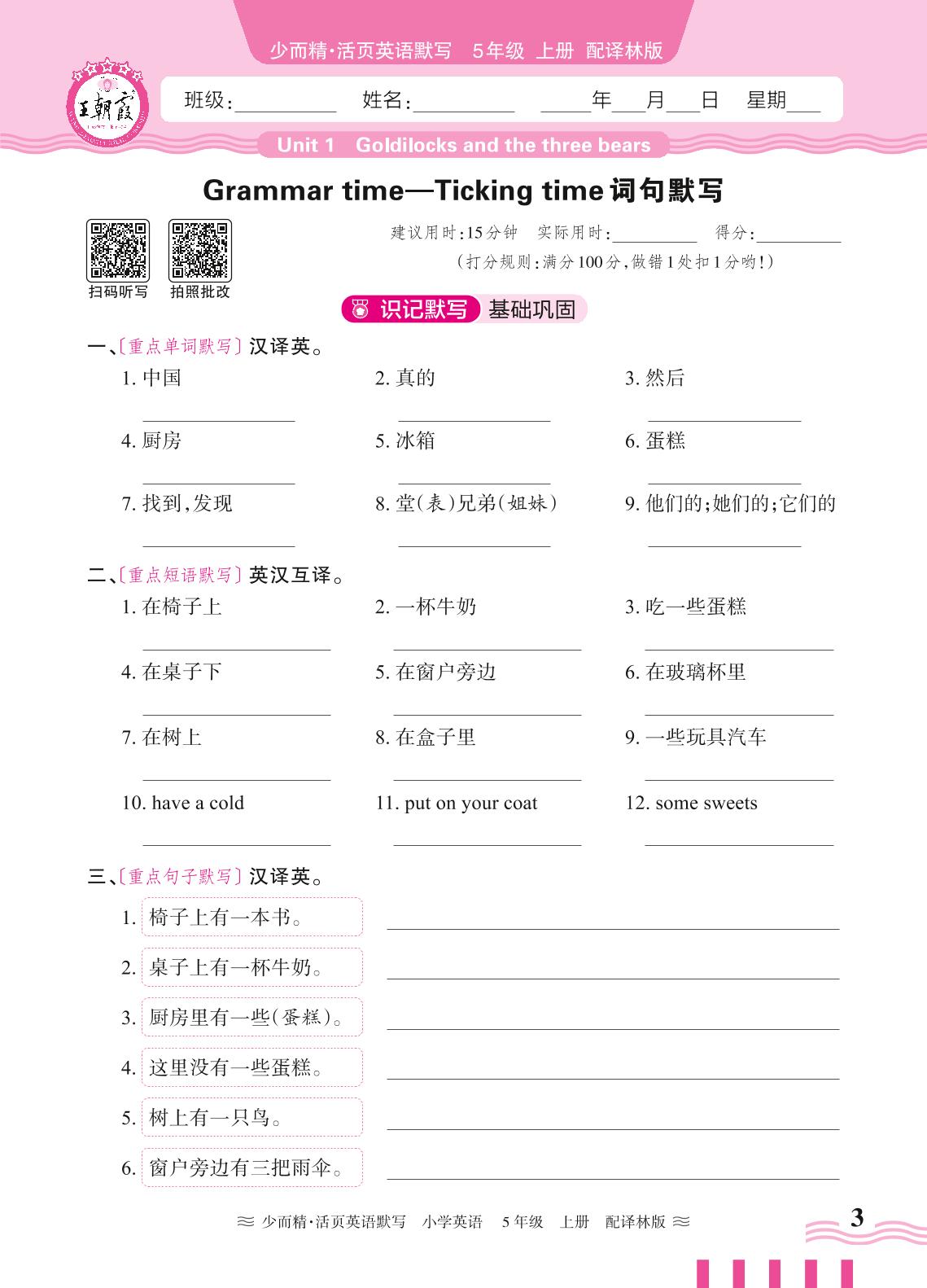 2024秋上册五年级英语译林版(三起始) Unit 1 Grammar time—Ticking time 词句默写