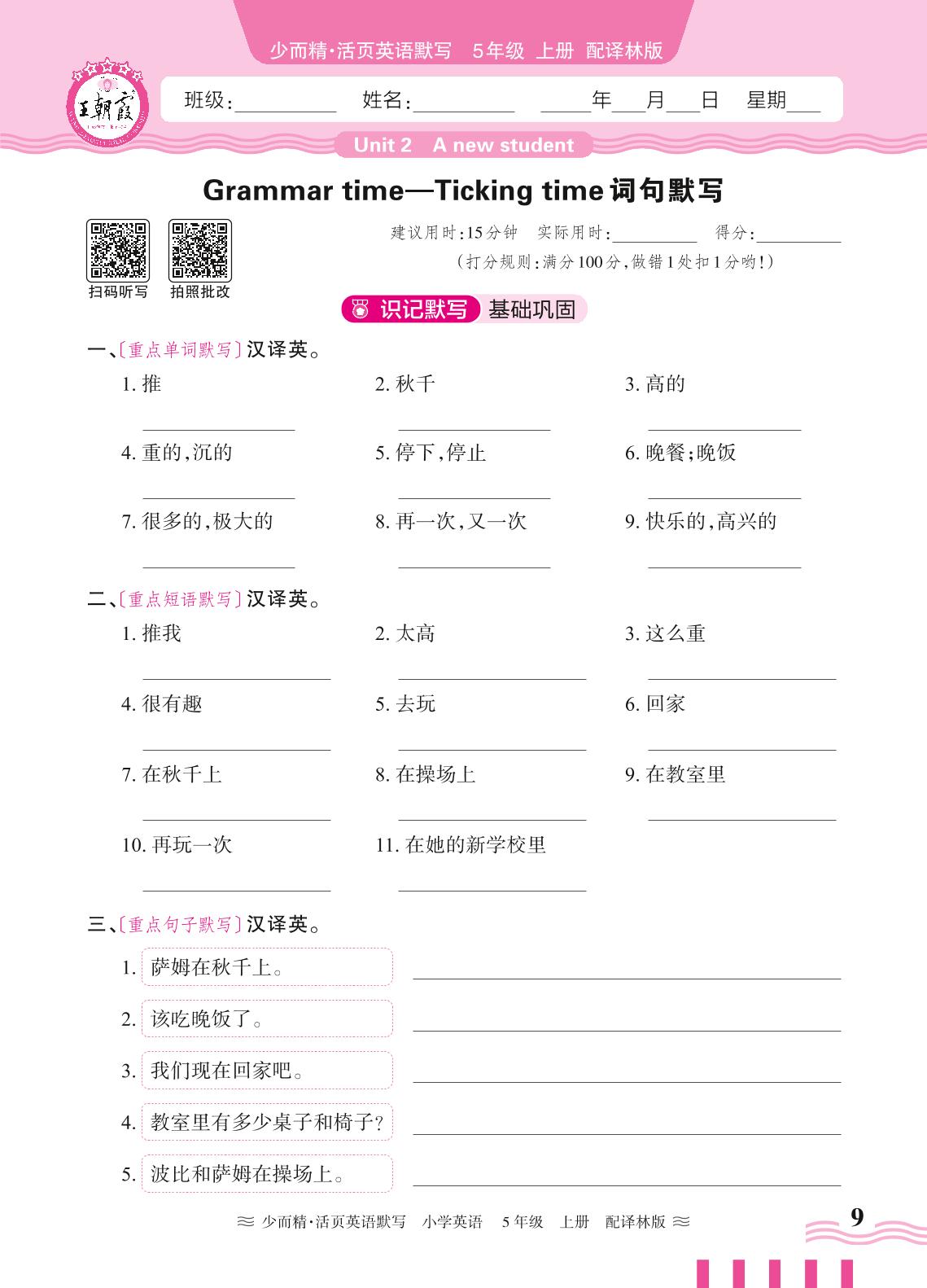 2024秋上册五年级英语译林版(三起始) Unit 2 Grammar time—Ticking time 词句默写