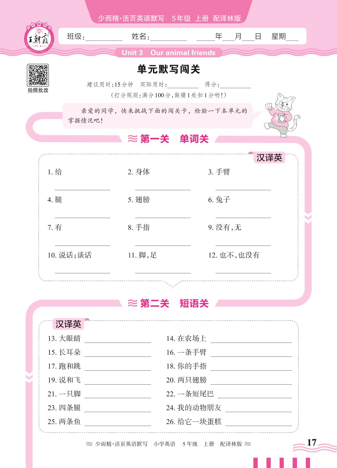 2024秋上册五年级英语译林版(三起始) Unit 3 单元默写闯关