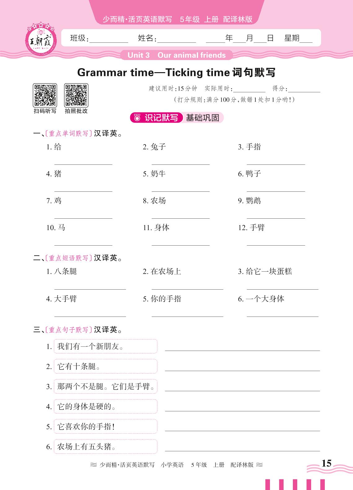 2024秋上册五年级英语译林版(三起始) Unit 3 Grammar time—Ticking time 词句默写
