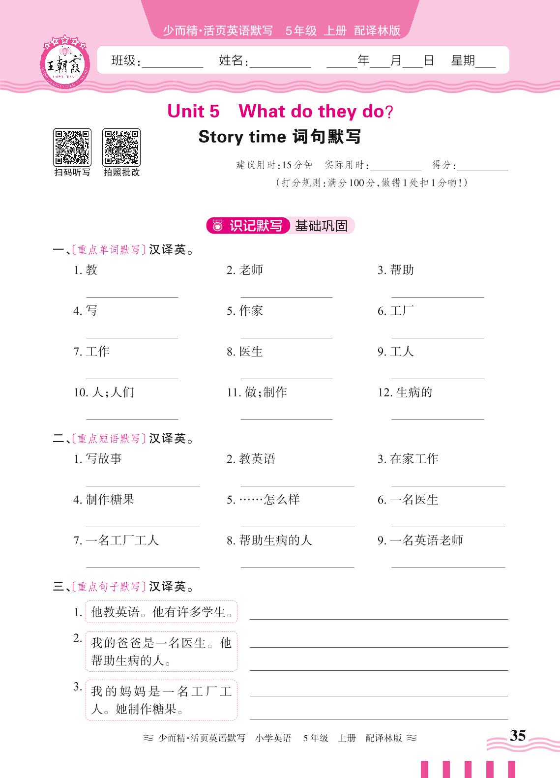 2024秋上册五年级英语译林版(三起始) Unit 5 Story time 词句默写